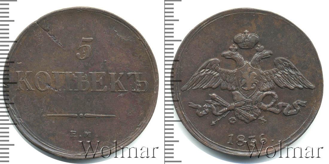 Ровная поверхность диска поделена прерывистой линией. Над геометрическим орнаментом двумя строками указан номинал «5 КОПЪЕКЪ», под ним – отметка монетного двора «Е.М.». Надписи выполнено горизонтально друг под другом, симметрично относительно центра.
