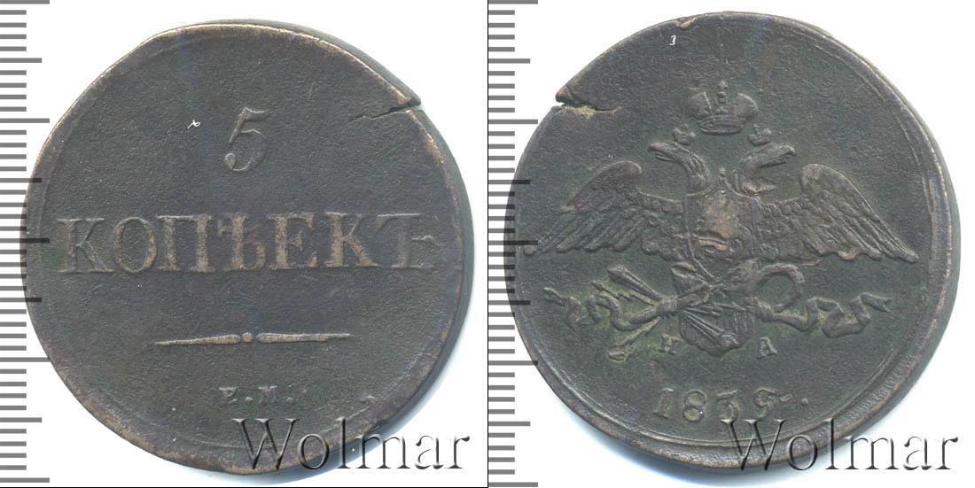 Оборот выполнен в консервативном стиле без дополнительных элементов. Надписи «5 КОПЪЕКЪ» И «Е.М.» разбавляет прерывистая прямая линия.