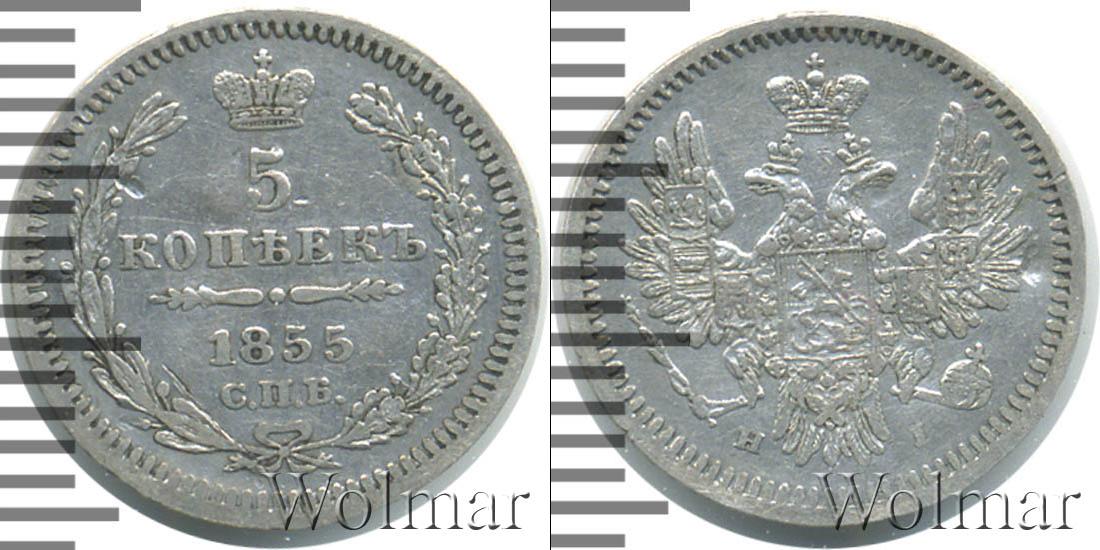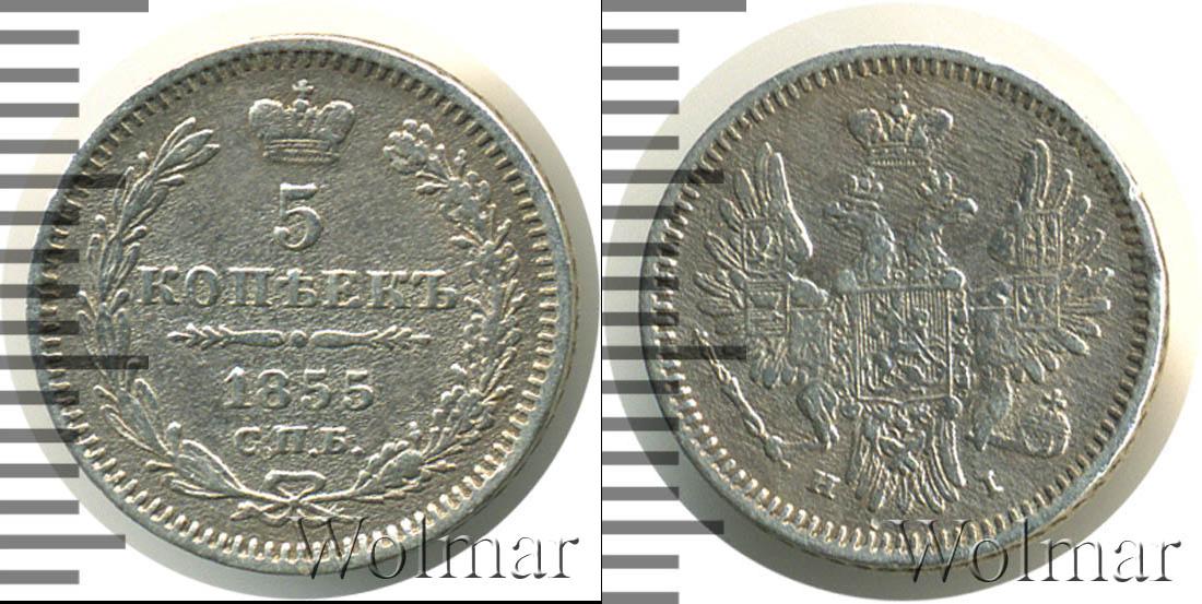Вверху детально прорисованная Императорская корона России. Ниже расположена надпись: 5 КОПЕЕК 1855 С.П.Б. Сделаны отметки о номинале, дате эмиссии и месте, где была отчеканена эта партия. Диск монеты украшает узор из лавровой и дубовой ветвей. По краю идет зубчатый орнамент.