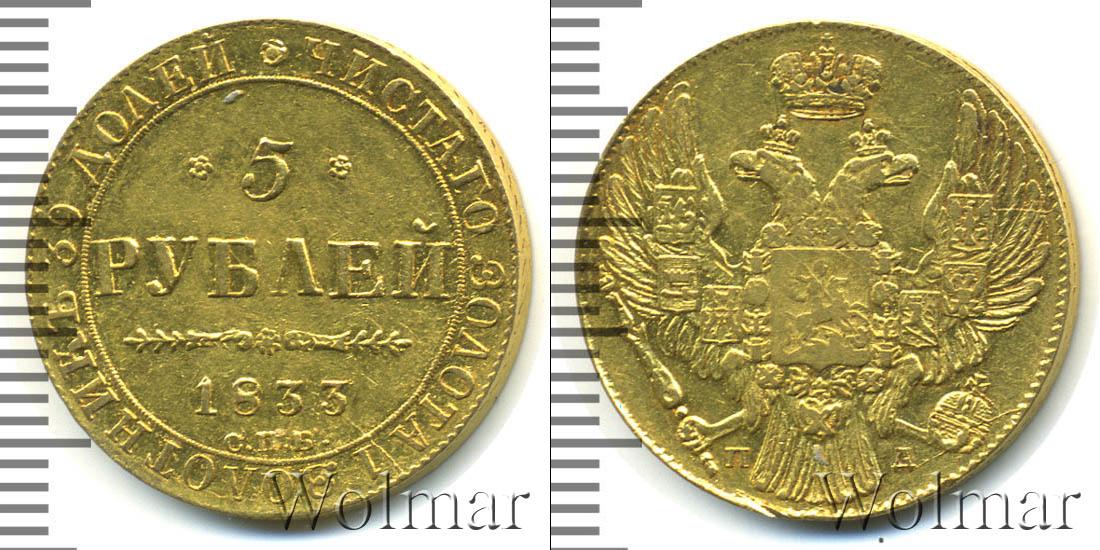 В центре расположена надпись: 5 РУБЛЕЙ 1833 С.П.Б. Эти гравировки говорят о номинале, дате эмиссии и монетном дворе, где была отчеканена эта партия. По краю диска начертано: ЧИСТОГО ЗОЛОТА 1 ЗОЛОТНИК 39 ДОЛЕЙ. Надпись разделяет цветочная розетка.