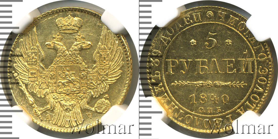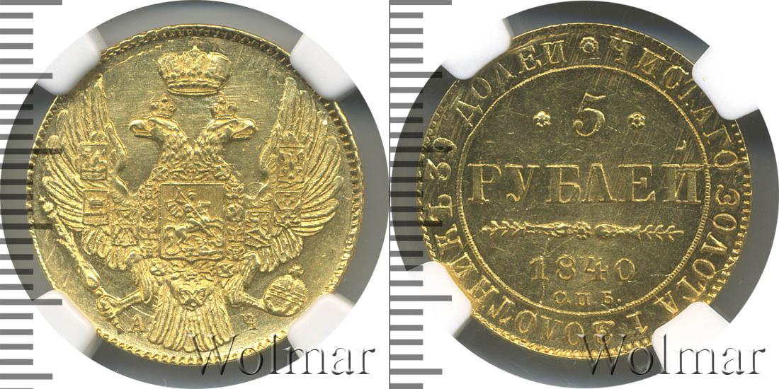 Вдоль гурта диска мы видим радиальную надпись «ЧИСТОГО ЗОЛОТА 1 ЗОЛОТНИК 39 ДОЛЕЙ». Вверху ее разделяет цветочная розетка. В центре отмечены номинал, год выпуска и монетный двор, где была отчеканена эта партия – 5 РУБЛЕЙ 1840 С.П.Б.