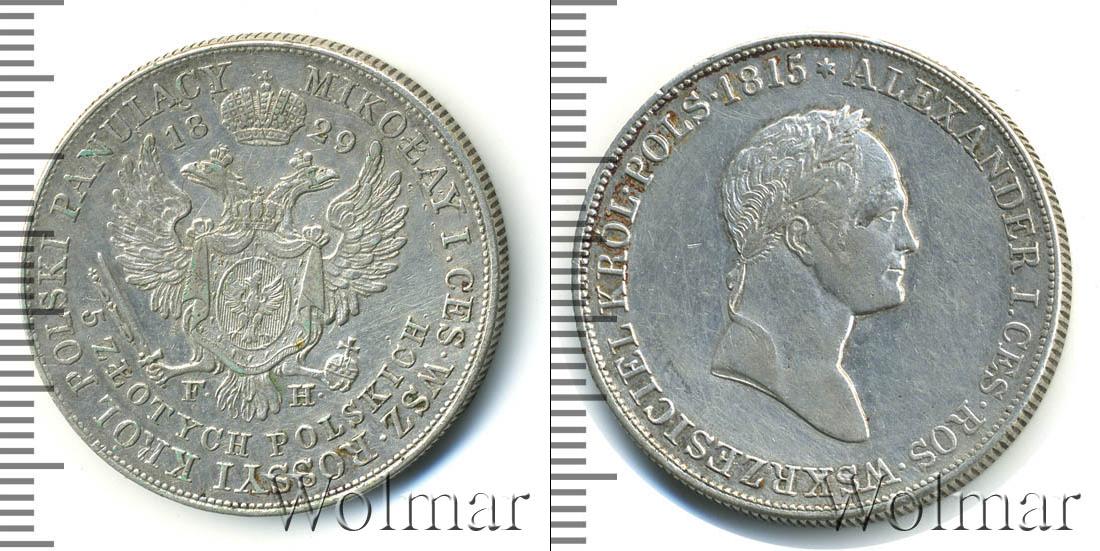 Центральная часть диска содержит изображение двуглавого орла. В лапах у птицы меч, скипетр и держава, над головой – имперская корона. Грудь орла украшена плащом с геральдикой королевства. Возле символа монархии написан год эмиссии «1829». По обе стороны от хвоста указаны инициалы минцмейстера «FH». Еще ниже радиально выгравирован номинал «5 Z?OTYCH POLSKICH». «MIKO?AY I. CES• WSZ• ROSSYI KR?L POLSKI PANUJ?CY» расположено вдоль канта.