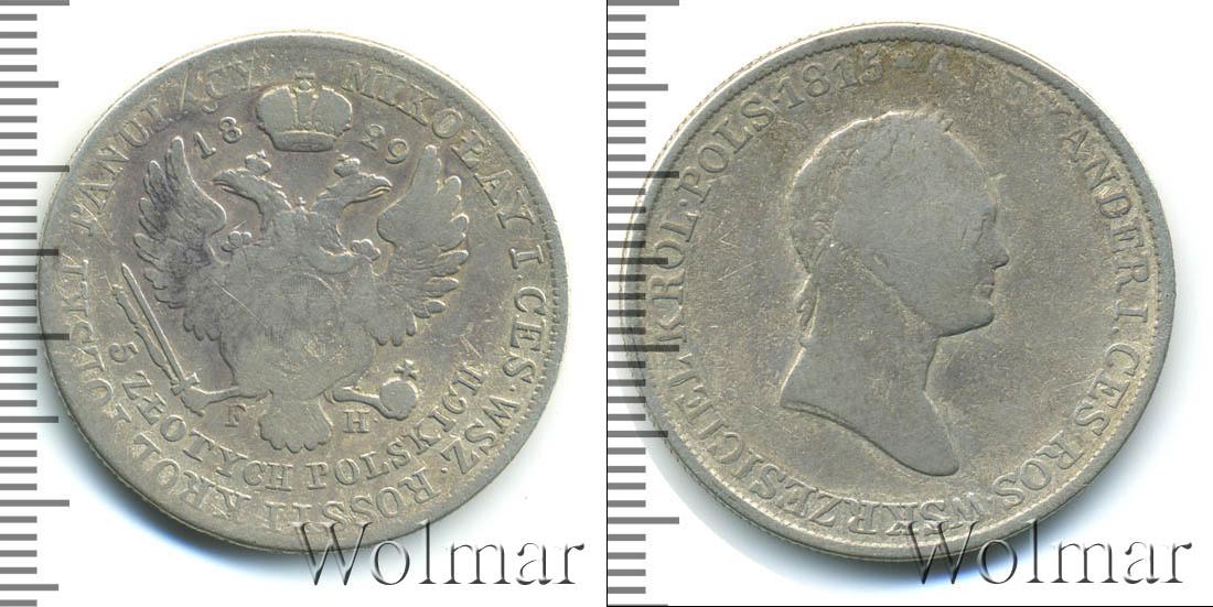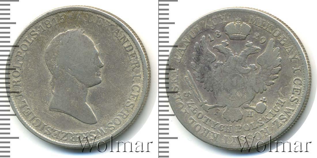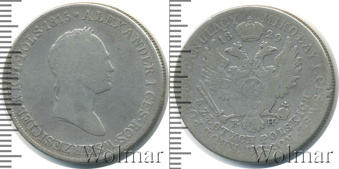 Центральная часть диска содержит изображение двуглавого орла. В лапах у птицы меч, скипетр и держава, над головой – имперская корона. Грудь орла украшена плащом с геральдикой королевства. Возле символа монархии написан год эмиссии «1829». По обе стороны от хвоста указаны инициалы минцмейстера «FH». Еще ниже радиально выгравирован номинал «5 Z?OTYCH POLSKICH». «MIKO?AY I. CES• WSZ• ROSSYI KR?L POLSKI PANUJ?CY» расположено вдоль канта.