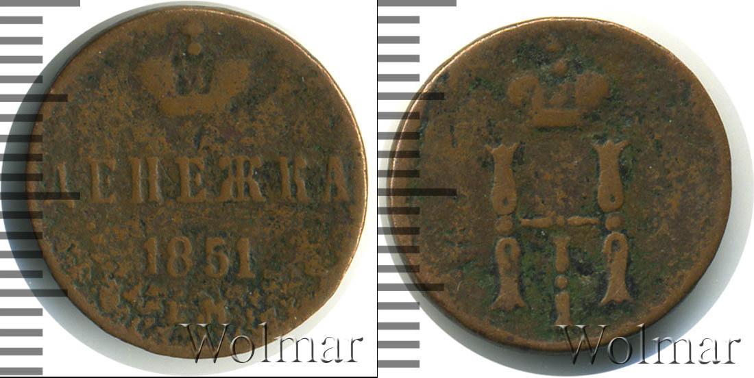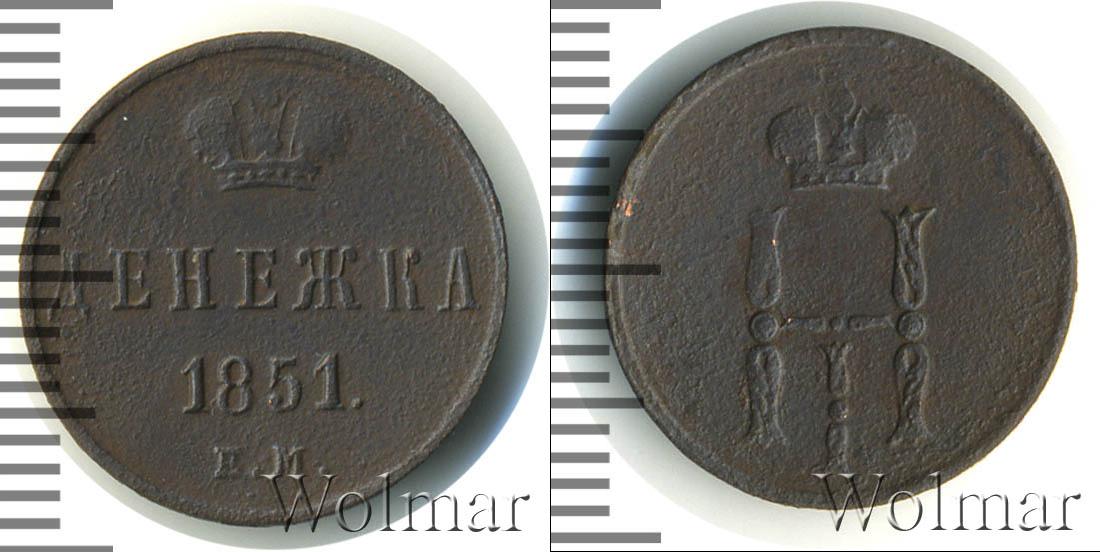 Монета отчеканена из меди. В верхней части диска изображена Корона Российской Империи. Также по центру отмечены дата эмиссии, номинал и Екатеринбургский монетный двор: ДЕНЕЖКА (что равняется 1/2 копейкам) 1851 Е.М.