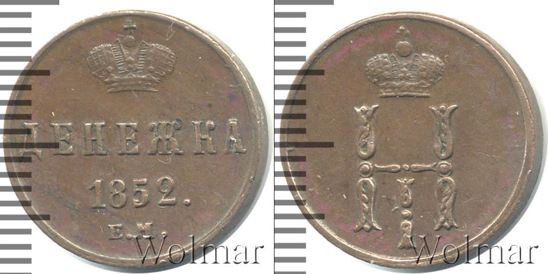 Сверху вниз расположена надпись: ДЕНЕЖКА (или 1/2 КОПЕЙКИ) 1852Е.М. Это обозначение номинала, даты эмиссии и Екатеринбургского монетного двора. Вверху Императорская корона России. Край диска оформлен аналогично аверсу.
