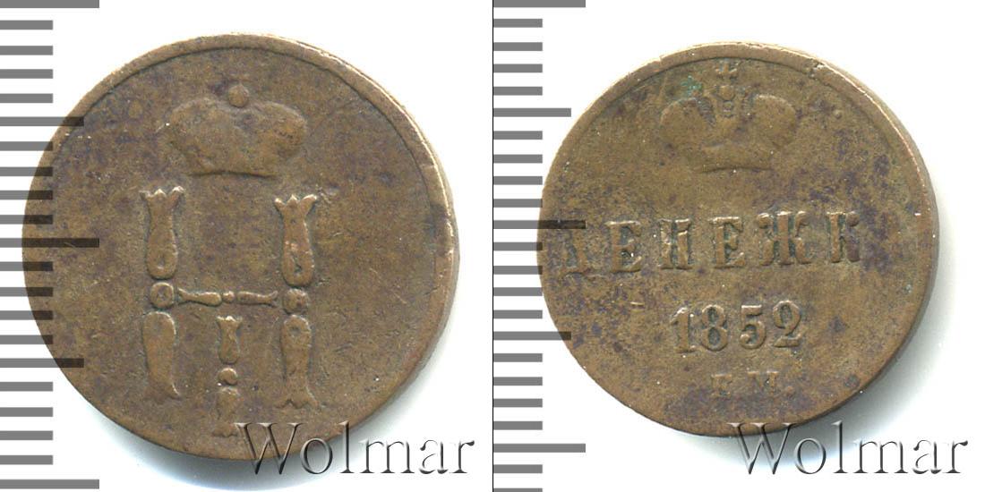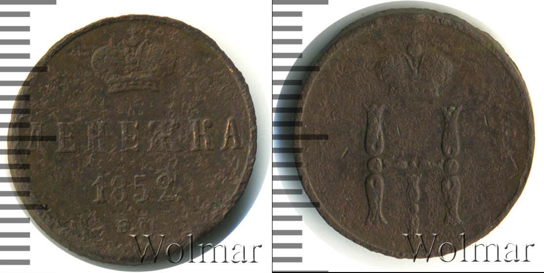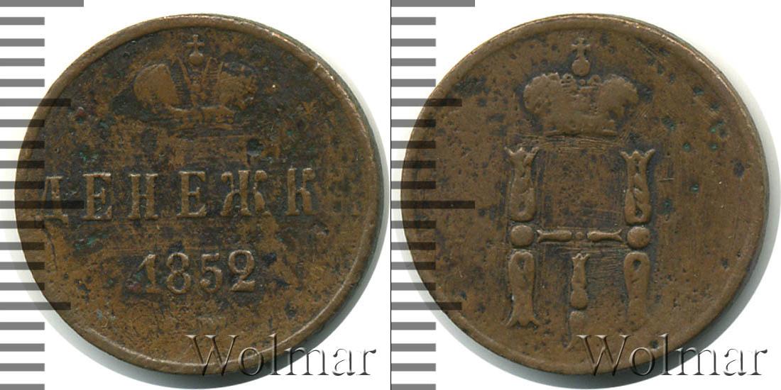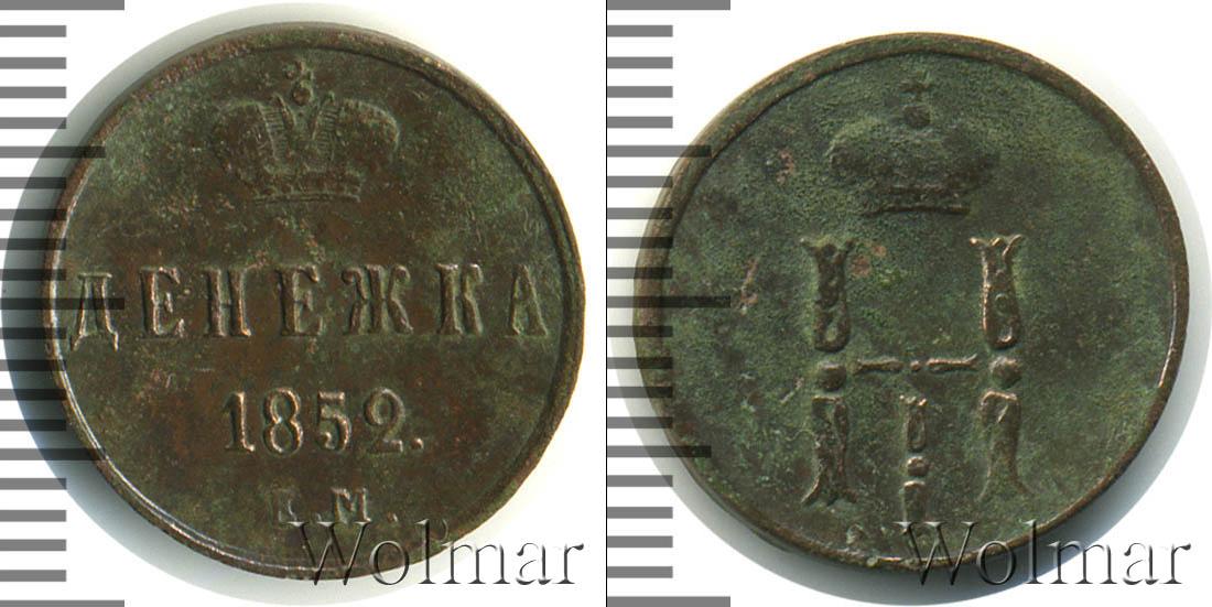 Сверху вниз расположена надпись: ДЕНЕЖКА (или 1/2 КОПЕЙКИ) 1852Е.М. Это обозначение номинала, даты эмиссии и Екатеринбургского монетного двора. Вверху Императорская корона России. Край диска оформлен аналогично аверсу.