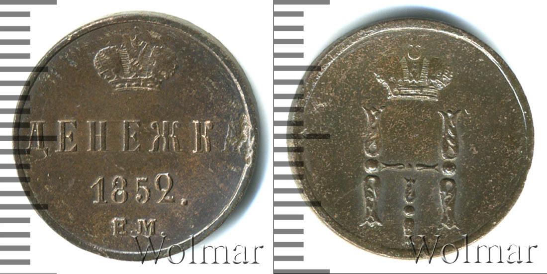 Сверху вниз расположена надпись: ДЕНЕЖКА (или 1/2 КОПЕЙКИ) 1852Е.М. Это обозначение номинала, даты эмиссии и Екатеринбургского монетного двора. Вверху Императорская корона России. Край диска оформлен аналогично аверсу.