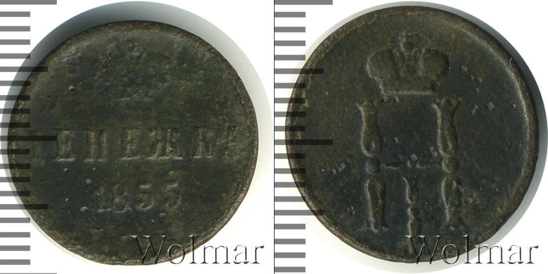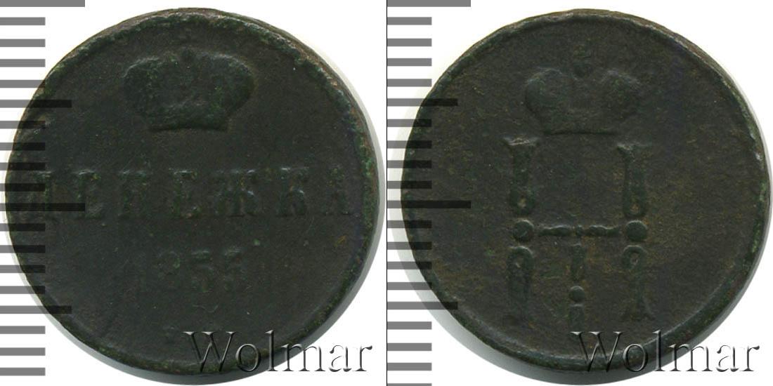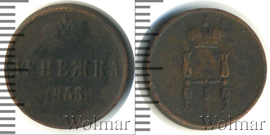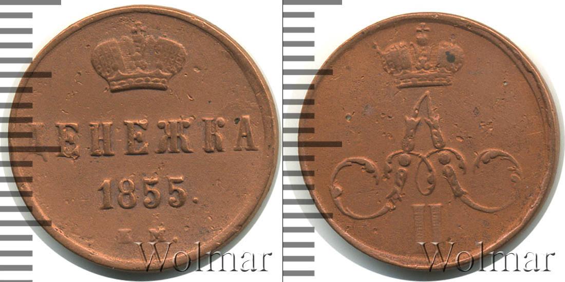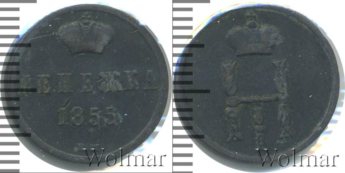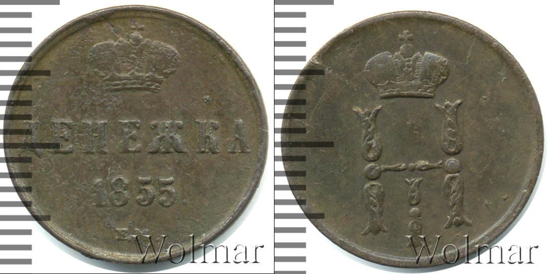 С оборотной стороны монеты представлена Большая корона Российской Империи (рельефное изображение). Ниже в три строки начертано: ДЕНЕЖКА 1855 Е.М. Это номинал, год выпуска партии медных монет и обозначение Екатеринбургского монетного двора.