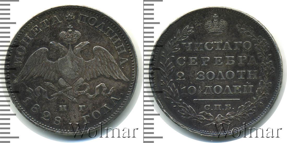 Серебряная монета с содержанием химически чистого металла 9 г. В центре изображение двуглавого орла с гербом города Москвы и императорской короной. В верхней части диска отмечен номинал: МОНЕТА ПОЛТИНА. А внизу инициалы минцмейстера Н.Грачева, и надпись: 1828 ГОДА (когда была выпущена эта партия).