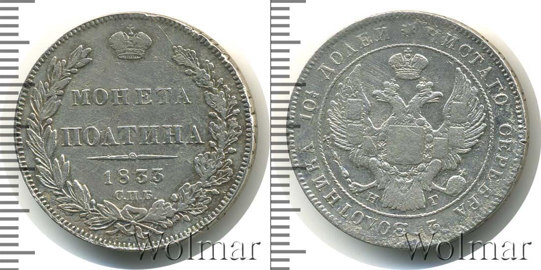 Корона России венчает надпись с указанием номинала и даты эмиссии монеты: МОНЕТА ПОЛТИНА 1833. Внизу мы видим отметку о монетном дворе – «С.П.Б.», а также узор из лавровой и дубовой ветвей, соединенных внизу узорчатой лентой.