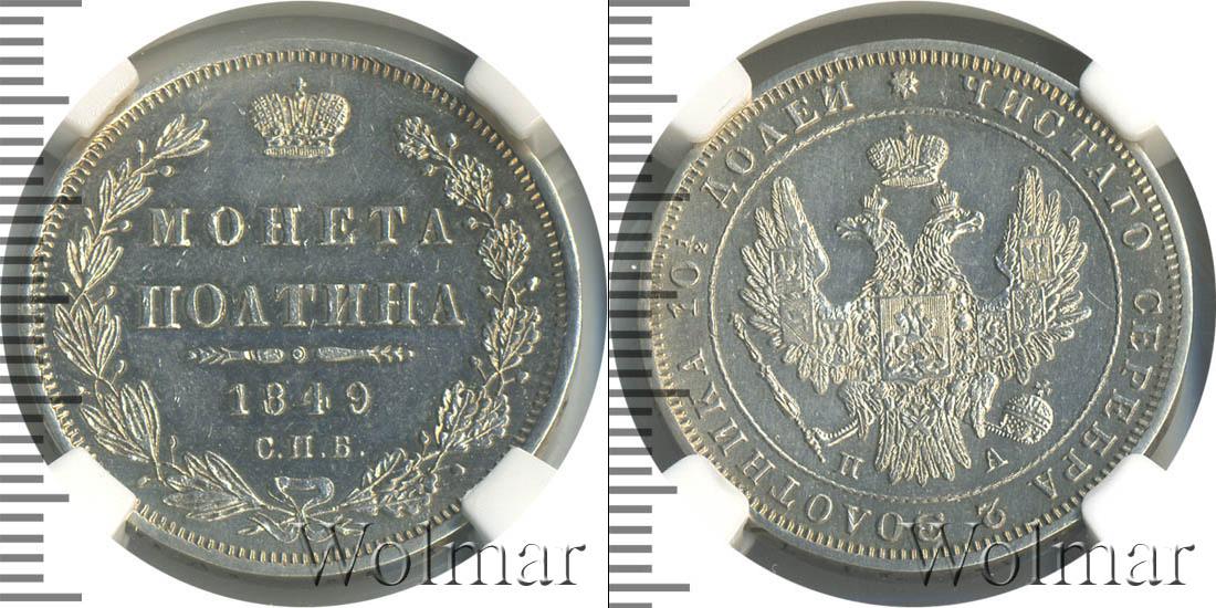 Вдоль канта монеты – зубчатый ободок. Вверху Императорская корона России, а ниже надпись: МОНЕТА ПОЛТИНА 1849 С.П.Б. (монетный двор Санкт-Петербурга). Диск монеты украшает изображение лавровой и дубовой ветвей, перевязанных лентой, а также волнистая линия с точкой посередине (после номинала).