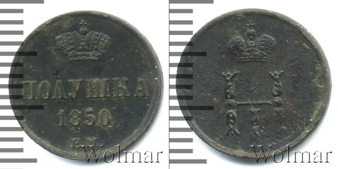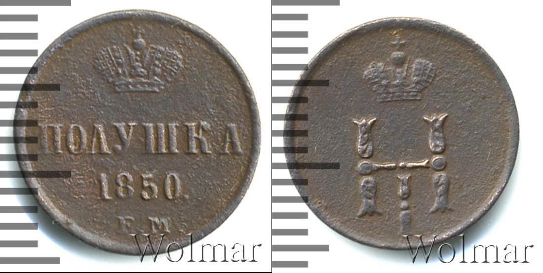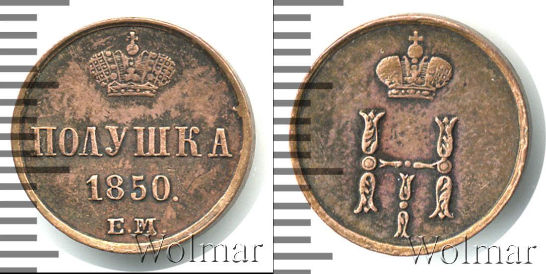 Одна из медных монет императора Николая Первого. По центру отмечены номинал, дата эмиссии партии и обозначение монетного двора: ПОЛУШКА (или 1/4 копейки) 1850 Е.М. Вверху расположена Большая корона Российской Империи.