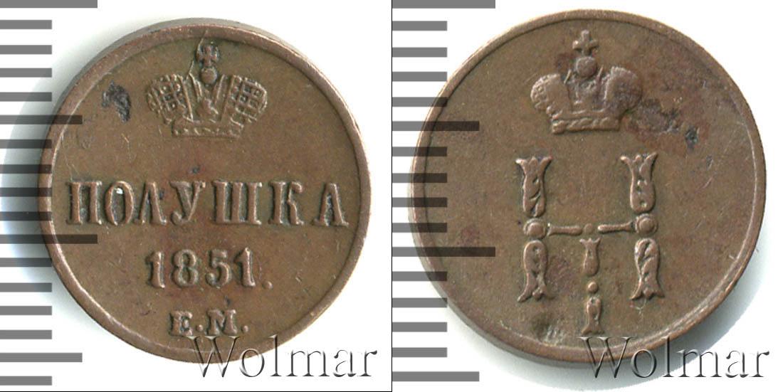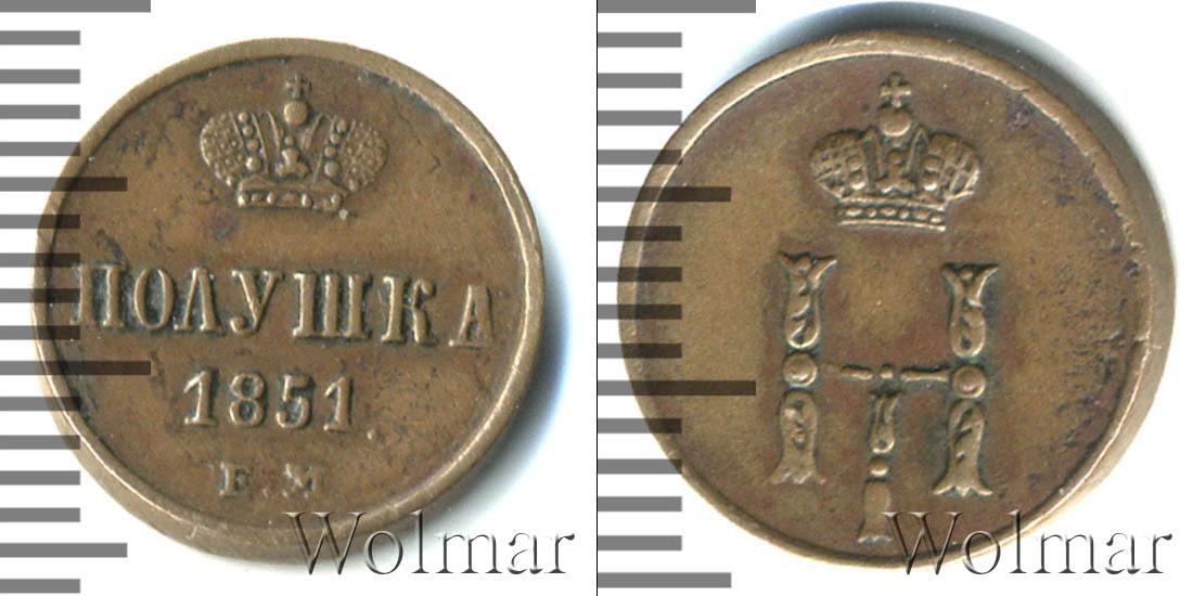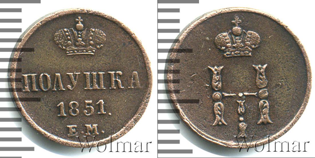 Край диска оформлен аналогично аверсу – плоский ободок. Он обрамляет надпись с указанием на номинал, год выпуска монеты и монетный двор Екатеринбурга: ПОЛУШКА 1851 Е.М. В верхней части диска мы видим Большую корону Российской Империи.