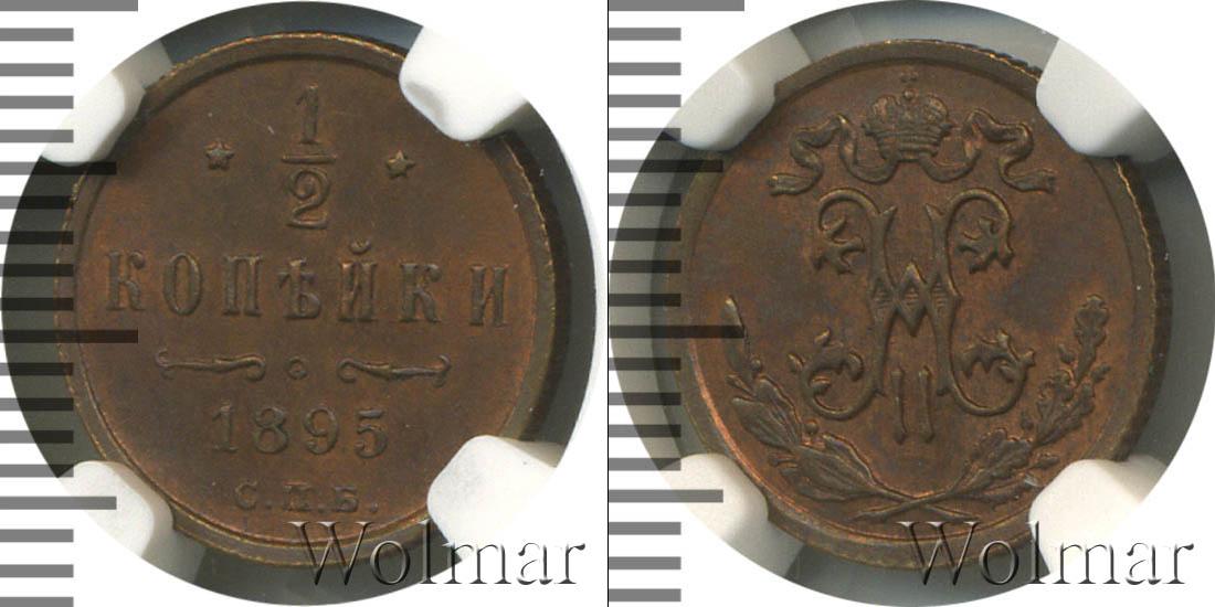 В слабе NGC. Санкт-Петербургский монетный двор. Биткин №# 949.266, тираж 2 992 009, вензель с четырьмя завитками вверху, Уздеников №# 3867, Казаков №# 20, тираж 2 302 000, рейтинг 5. По каталогу Wolmar # 203/36. 1/2 копейки СПБ