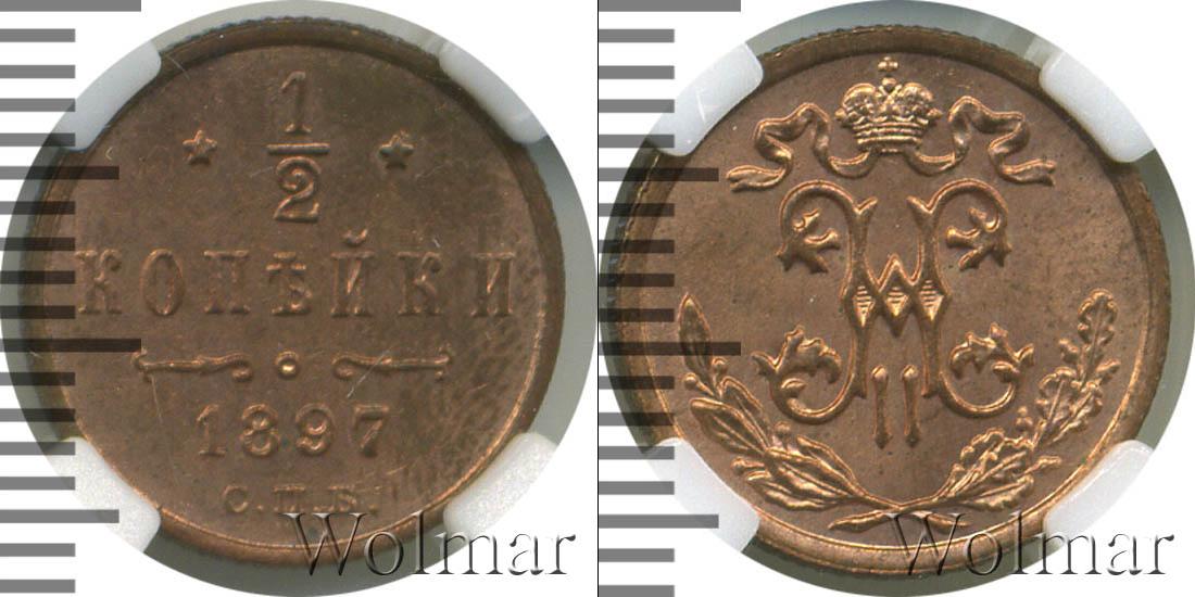 В слабе HHP. Бирмингемский монетный двор. Биткин №# 950.293, тираж 75 000 000, Уздеников №# 3877, Казаков №# 96, тираж 60 000 000, рейтинг 14. По каталогу Wolmar # 203/38. 1/2 копейки СПБ