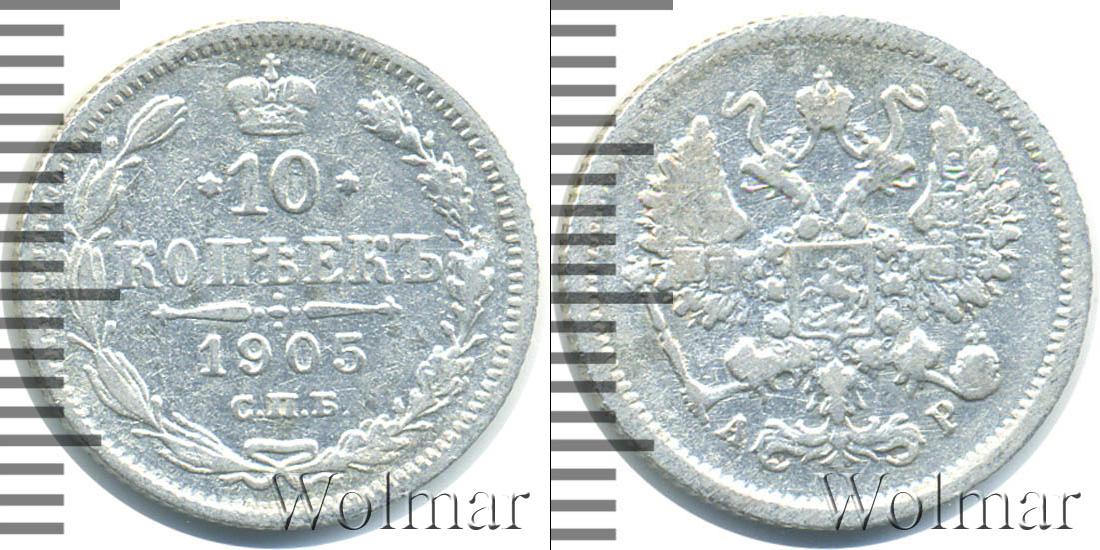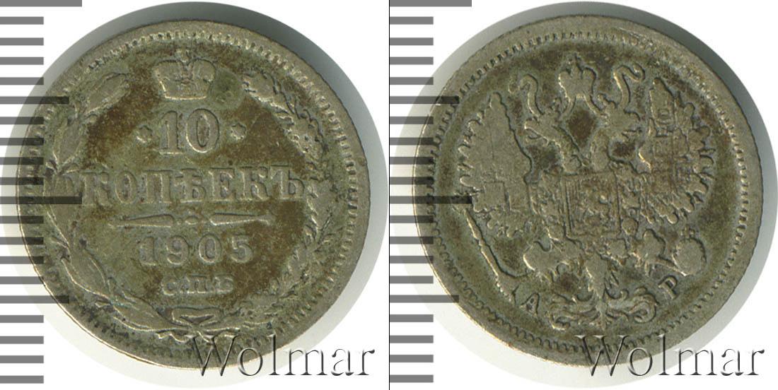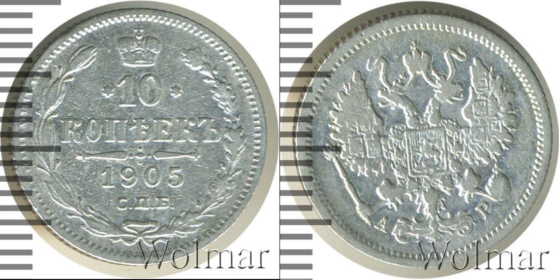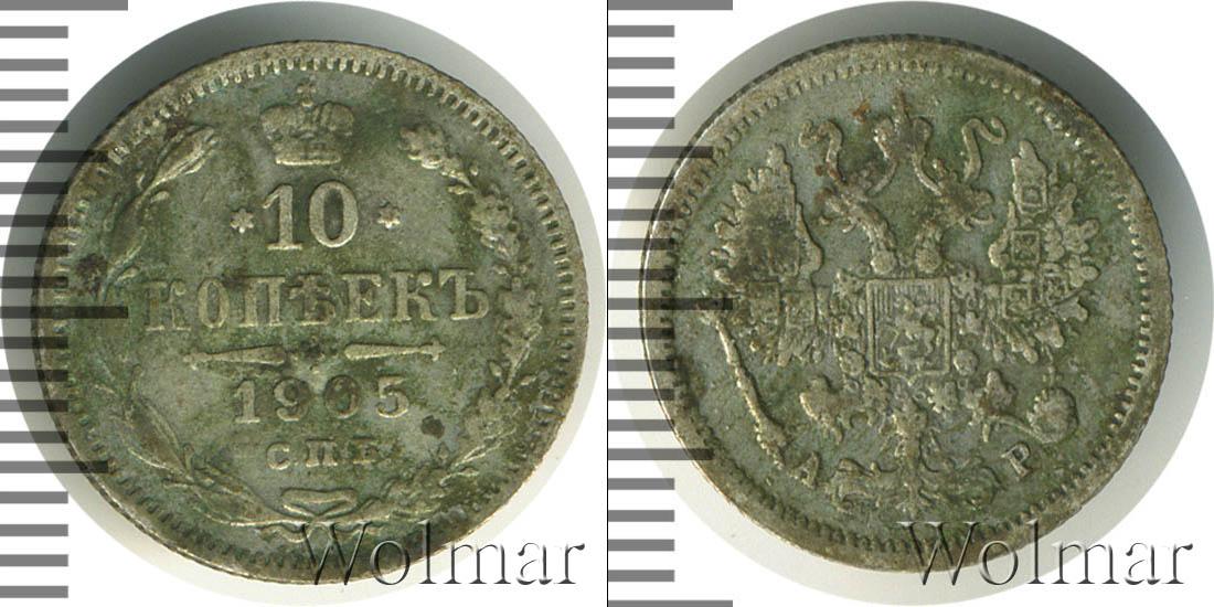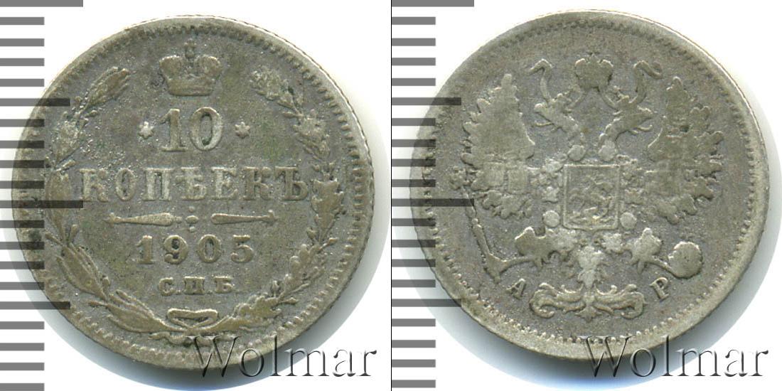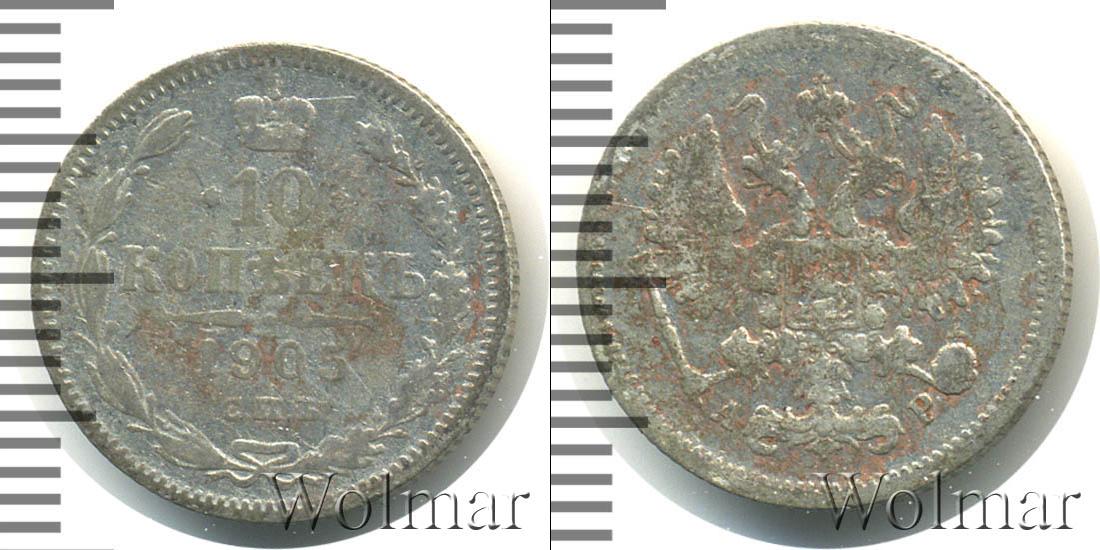 Большую часть диска монеты занимает узор из дубовой и лавровой ветвей, соединенных лентой. По центру указаны номинал, дата выпуска монеты и монетный двор, где была отчеканена партия: 10 КОПЕЕК 1905 С.П.Б. Вверху императорская корона России.