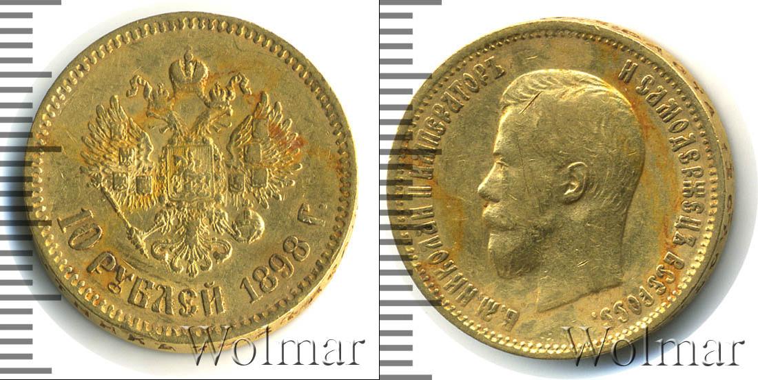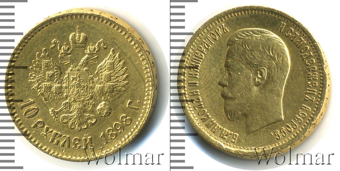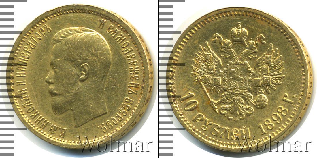 Изображение Малого герба Российской Империи, ключевым элементом которого является двуглавый орел с короной. Внизу расположена надпись: 10 РУБЛЕЙ 1898 г. По канту идет зубчатый орнамент.