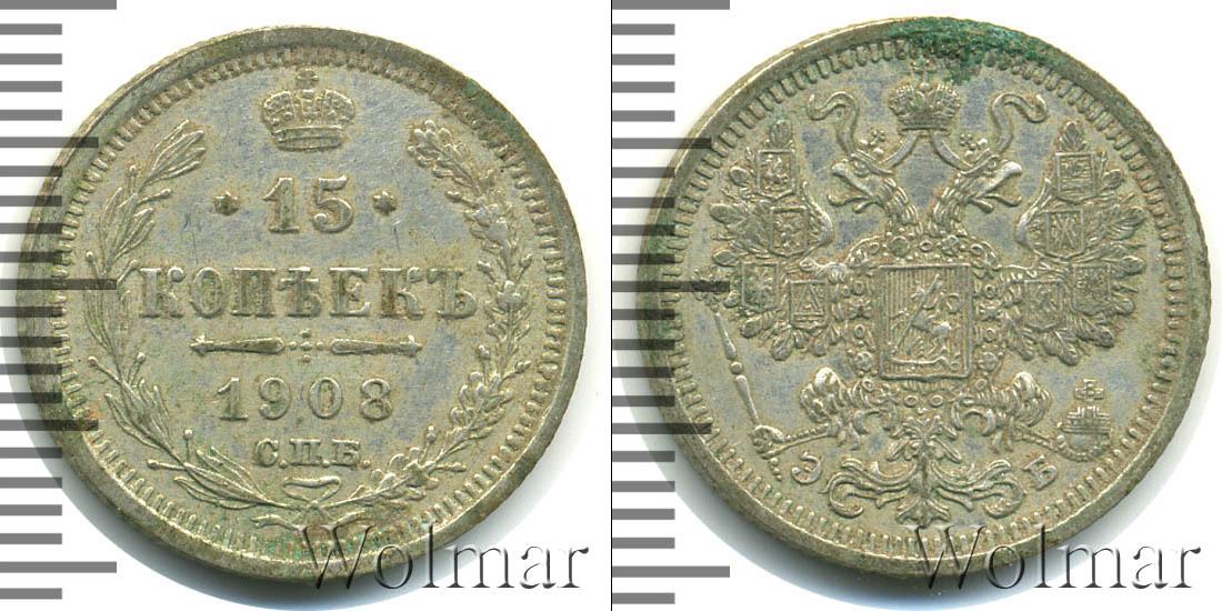 По центру указан номинал «15 копеек», с двух сторон обрамленный выпуклыми звездами, а также дата выпуска монеты «1908» и оттиск Санкт-Петербургского монетного двора «СПБ». Композицию венчает корона. Полукругом вдоль края монеты выгравированы ветви дуба –