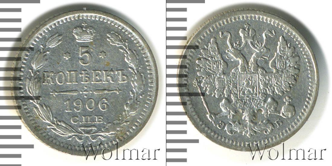 Вверху находится рельефная императорская корона. Внизу лавровая и дубовая ветви, переплетенные между собой лентой. По центру отмечены номинал и дата выпуска монеты: 5 КОПЕЕК 1906. Ниже оттиск монетного двора: С.П.Б.