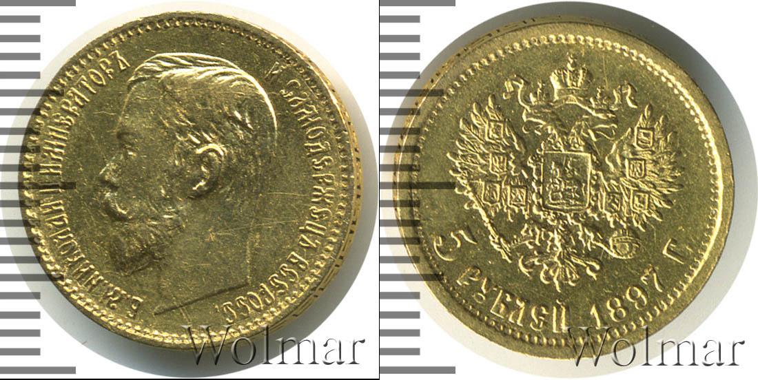 Забоины по канту. Санкт-Петербургский монетный двор. Биткин №# 935.18, тираж 5 372 000; Уздеников №# 0326. Нормативная проба - Au`900, нормативный вес - 4,30 гр, чистого золота - 3,87гр. По каталогу Wolmar # 20/1-2 5 рублей АГ