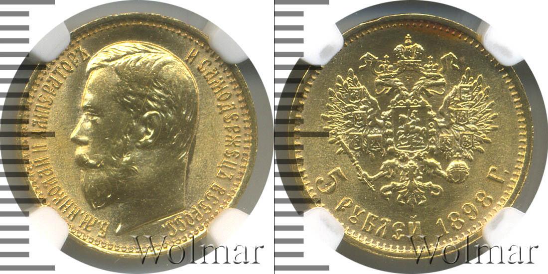 В круг зубчатого канта вписан герб Российской Империи периода царствия Николая II. Под двуглавым орлом с символами государственности: короной, скипетром и державой, написано «5 РУБЛЕЙ 1898 г.».