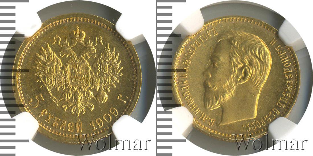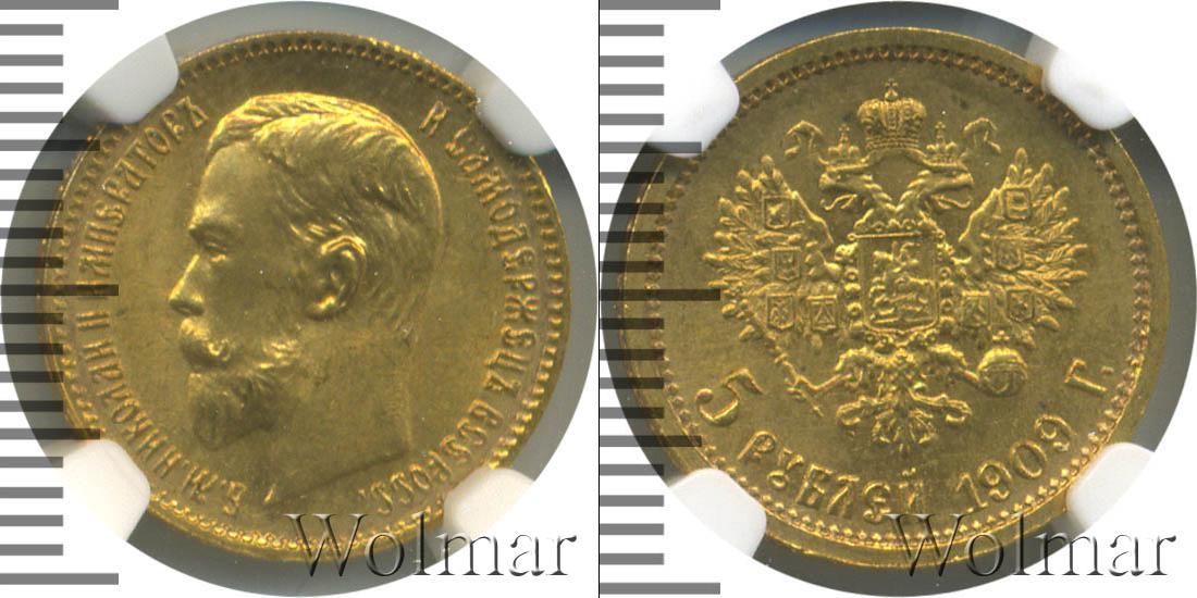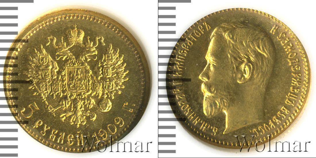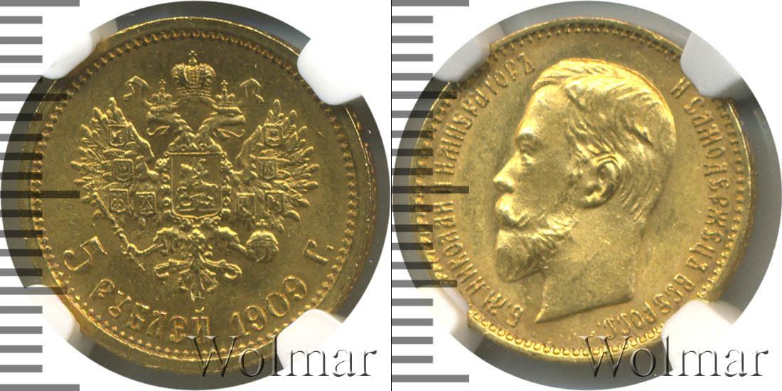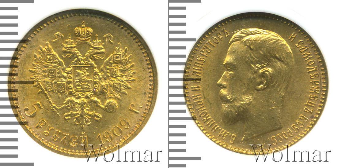 Геральдический символ Царской России периода правления Николая II. На расправленных крыльях коронованного орла изображены малые гербы. В лапах — скипетр и держава. Вдоль нижнего полукруга написано «5 РУБЛЕЙ 1909 г.». Периметр легенды украшен «зубчатым» ка