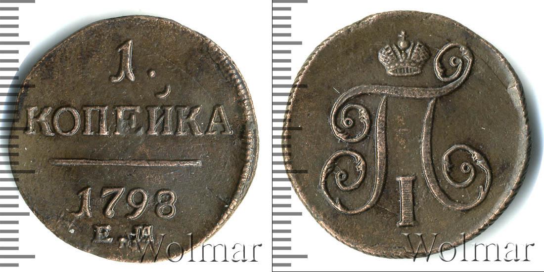 Гладкая поверхность диска разделена ровной горизонтальной линией. Над ней обозначен номинал «1 КОПЕЙКА». В нижнем полукруге есть сведения о монетном дворе и годе эмиссии. Информация «К.М.» сверху украшает надпись «1798».