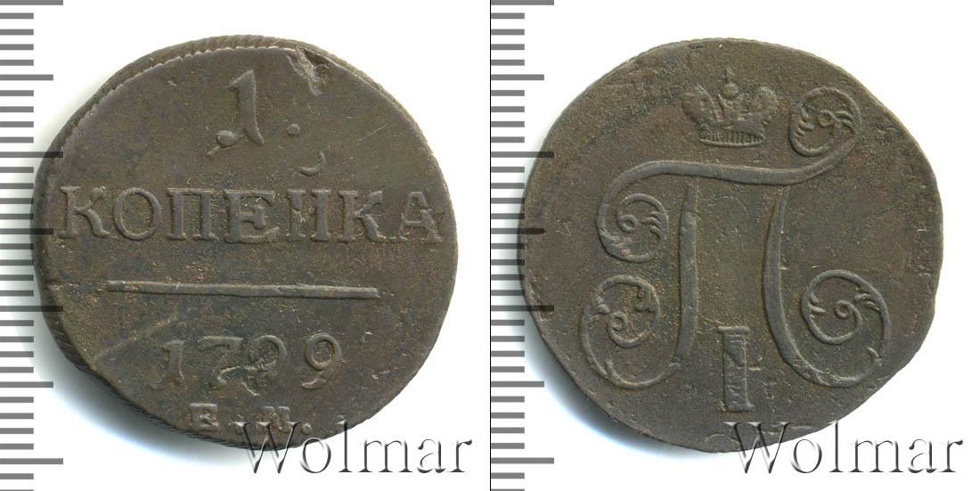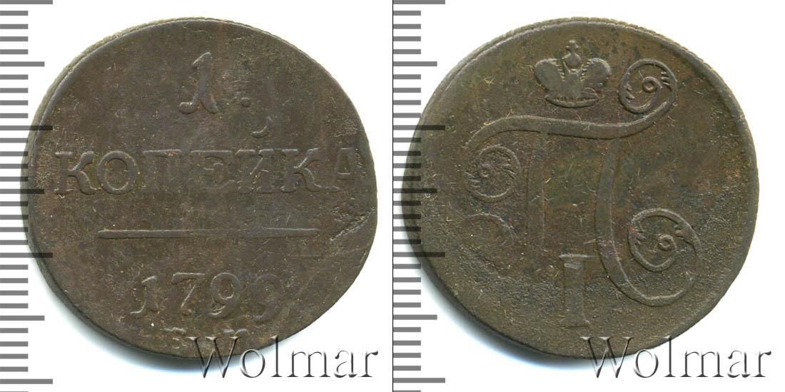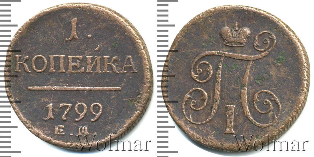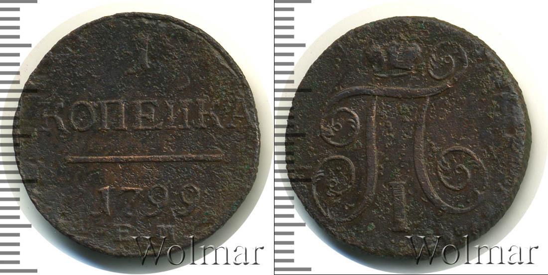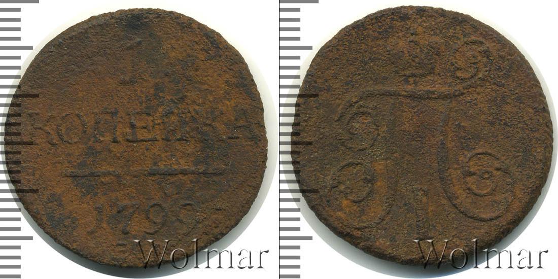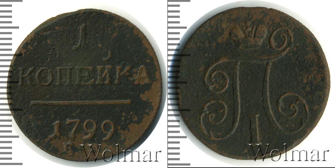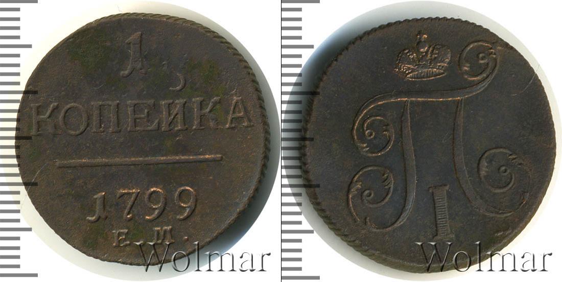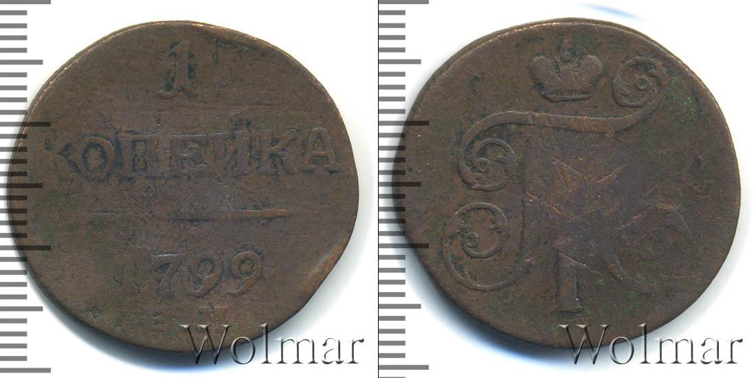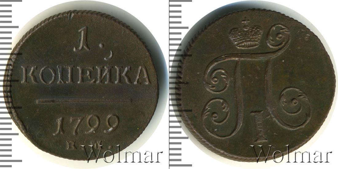 Горизонтальные надписи украшают ровную поверхность диска. Верхней строчкой обозначен количественный показатель номинала «1». Под цифрой указана валюта «КОПЕЙКИ». Надпись отделена от года эмиссии ровной линией. Нижней строчкой указан товарный знак монетного двора «К.М.» сразу под надписью «1799».