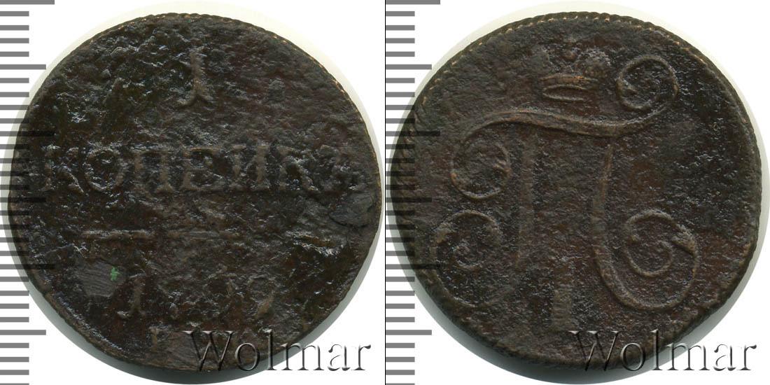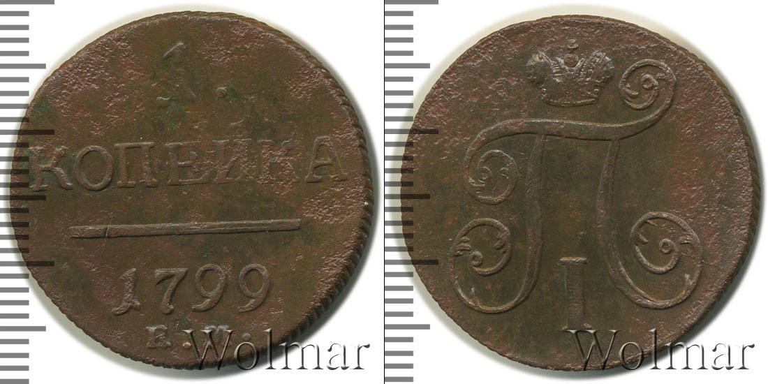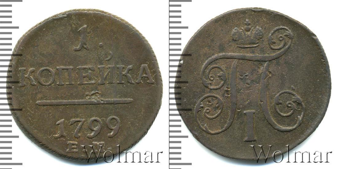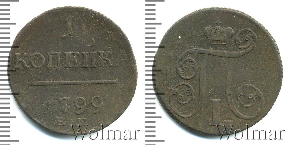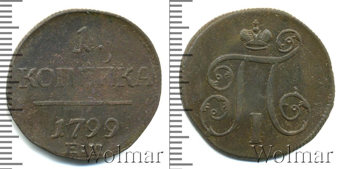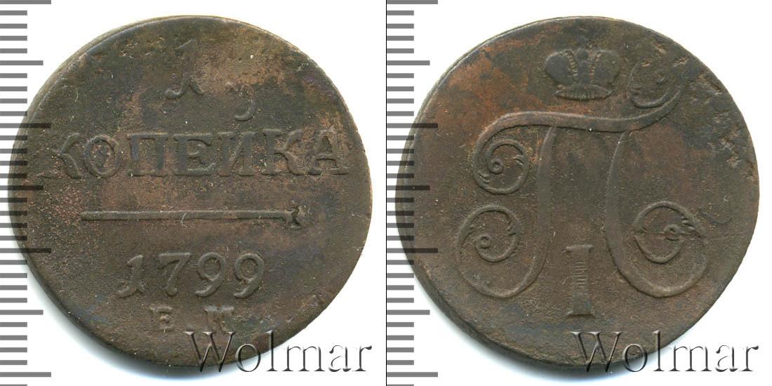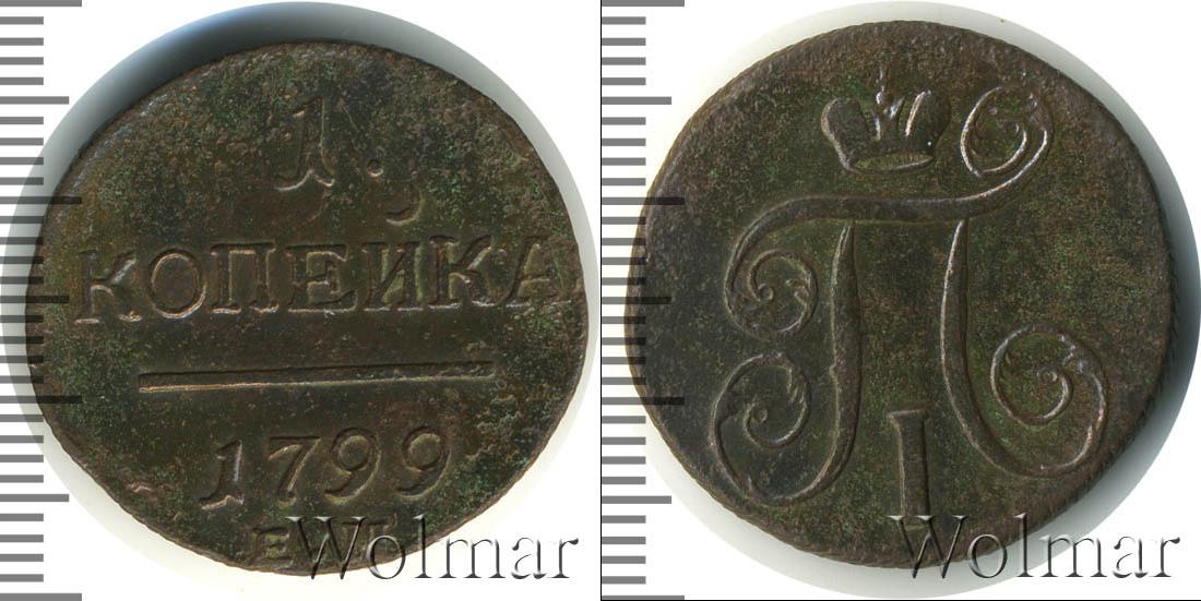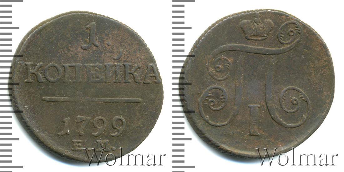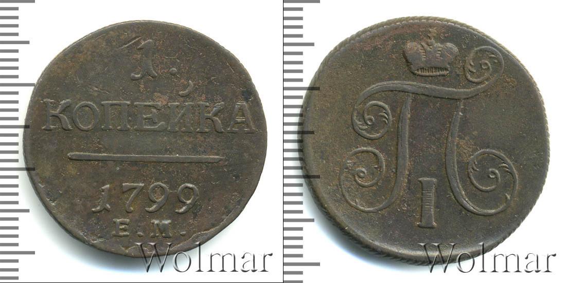 Горизонтальные надписи украшают ровную поверхность диска. Верхней строчкой обозначен количественный показатель номинала «1». Под цифрой указана валюта «КОПЕЙКИ». Надпись отделена от года эмиссии ровной линией. Нижней строчкой указан товарный знак монетного двора «К.М.» сразу под надписью «1799».