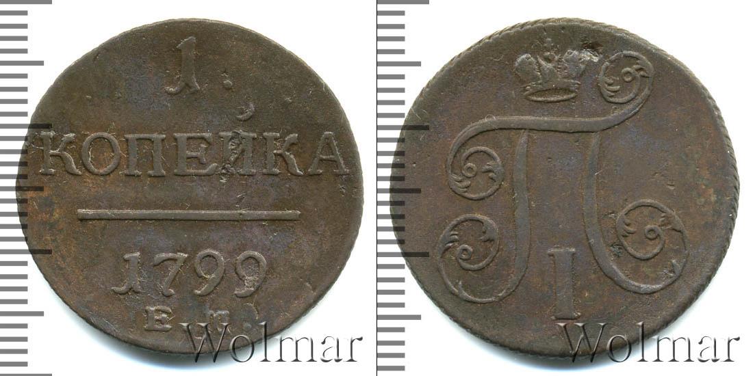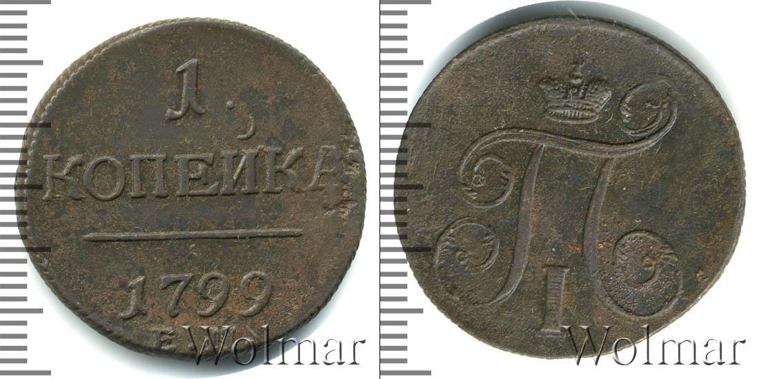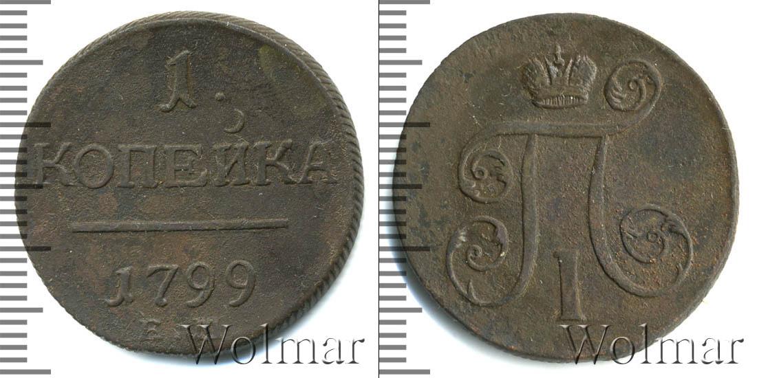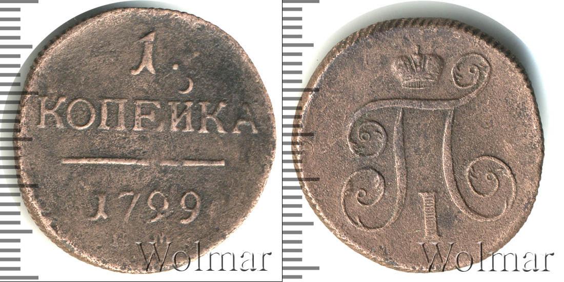 Горизонтальные надписи украшают ровную поверхность диска. Верхней строчкой обозначен количественный показатель номинала «1». Под цифрой указана валюта «КОПЕЙКИ». Надпись отделена от года эмиссии ровной линией. Нижней строчкой указан товарный знак монетного двора «К.М.» сразу под надписью «1799».