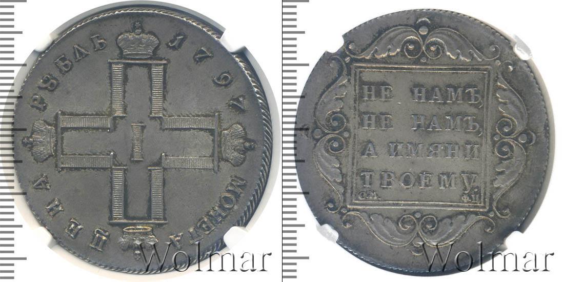 Серебряная монета массой 29,25 г. и диаметром 41 мм. По краю диска идет зубчатый ободок. В центре инициалы Павла Первого в виде четырех скрещенных букв «П» (в обрамлении корон) и с римской цифрой I (по центру стилизованного креста). Вверху полукругом начертано: МОНЕТА ЦЕНА, а внизу надпись – РУБЛЬ 1797.