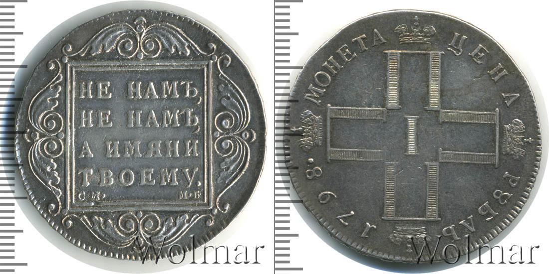 Большую часть диска монеты занимает стилизованный крест из четырех букв «П» с коронами и римской цифрой «I» посередине. Вверху начертано: МОНЕТА ЦЕНА. А внизу расположена надпись: РУБЛЬ 1798 (это указание на номинал и дату эмиссии).