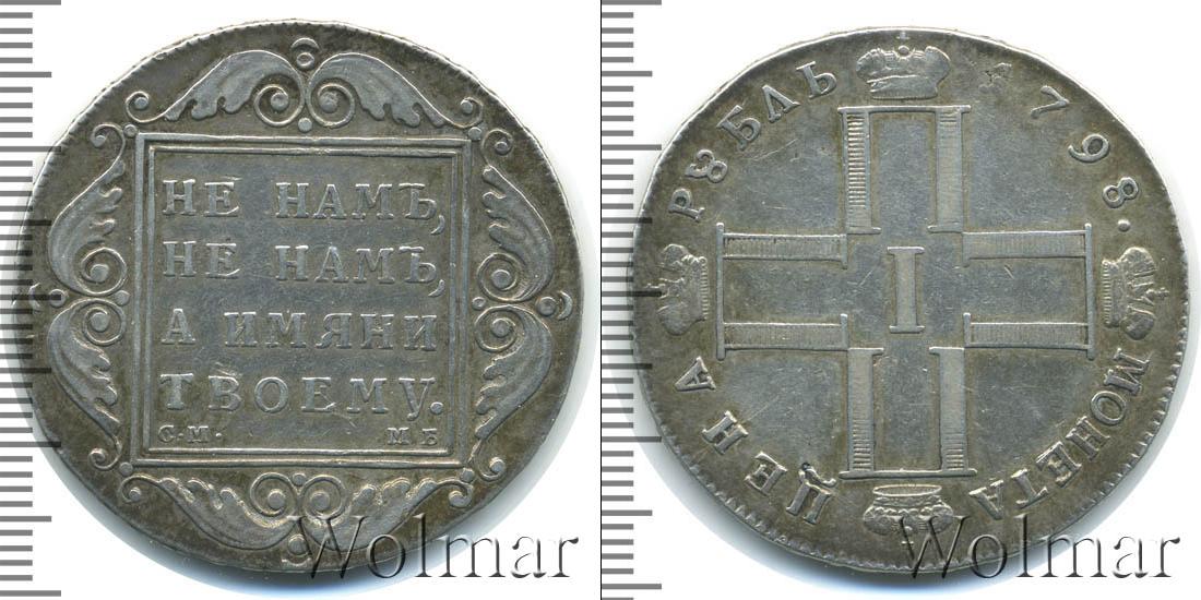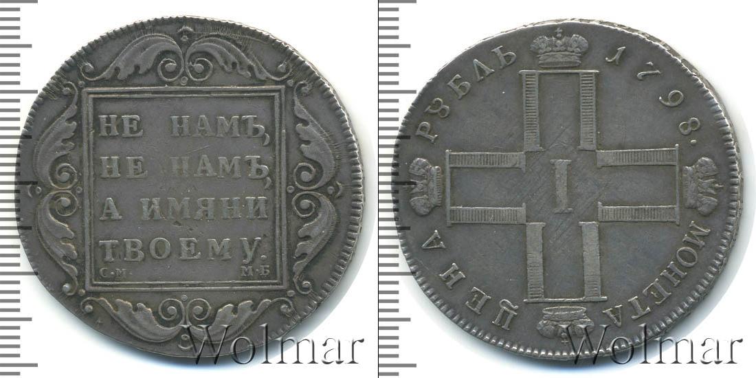Большую часть диска монеты занимает стилизованный крест из четырех букв «П» с коронами и римской цифрой «I» посередине. Вверху начертано: МОНЕТА ЦЕНА. А внизу расположена надпись: РУБЛЬ 1798 (это указание на номинал и дату эмиссии).