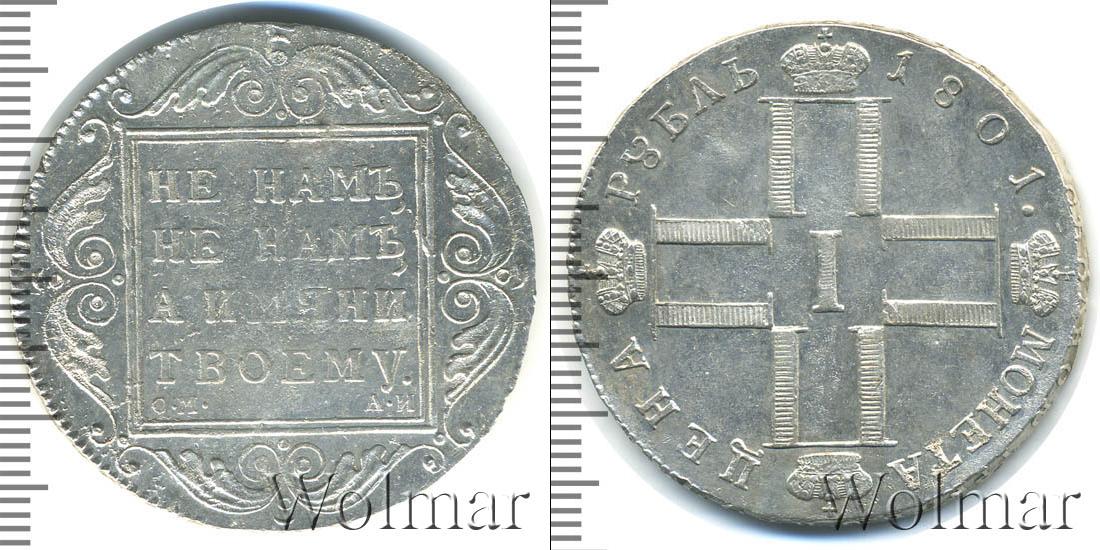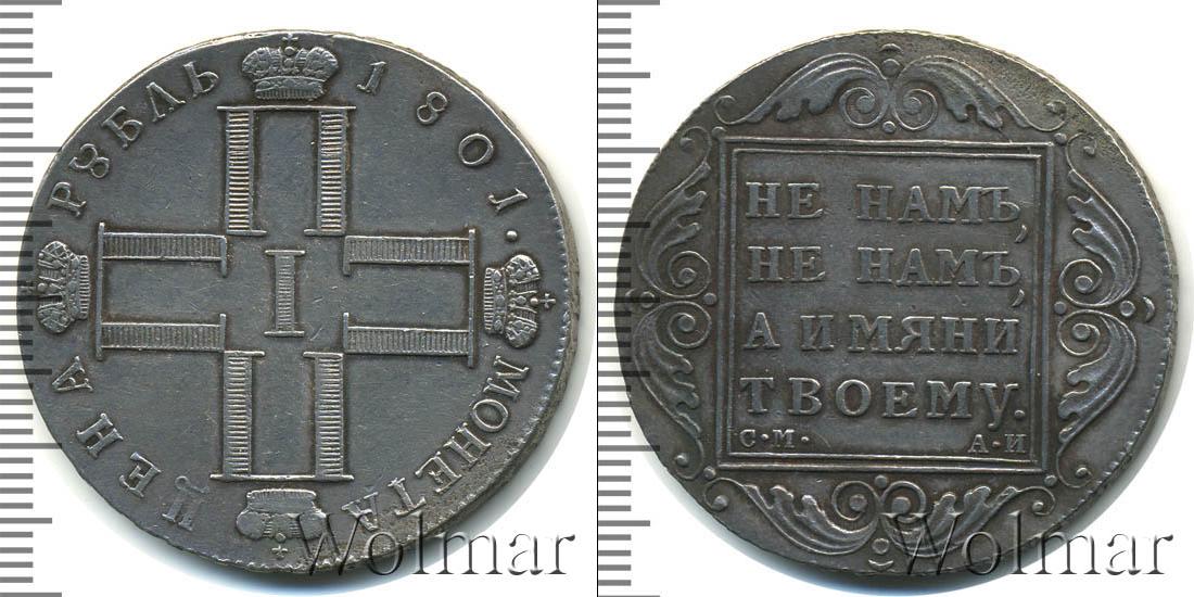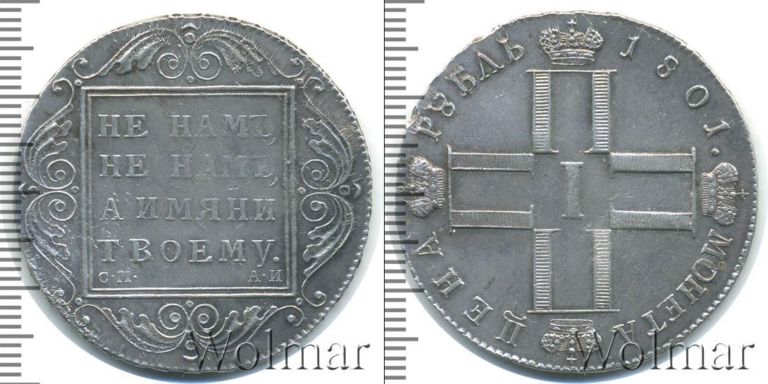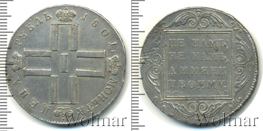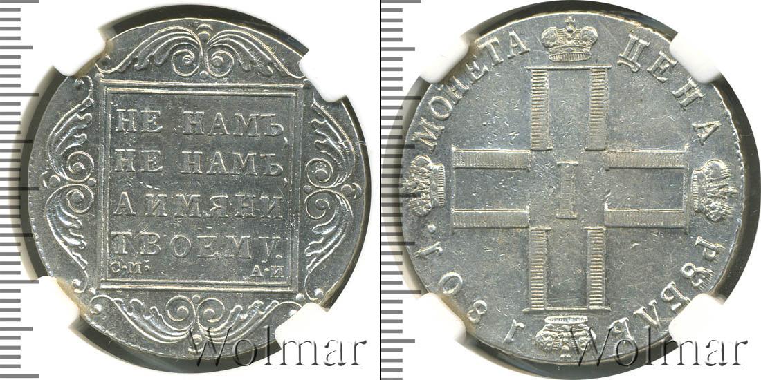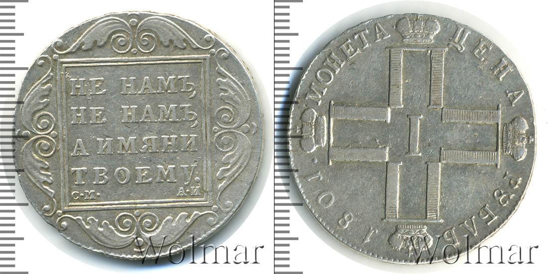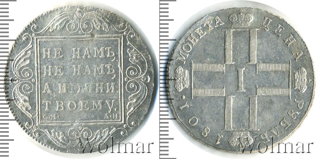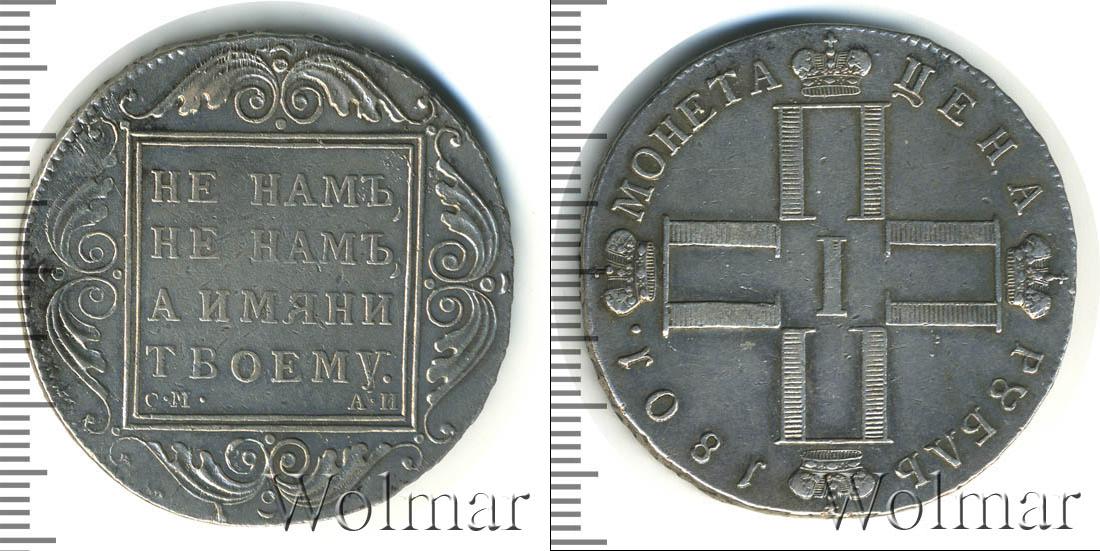 Одна из серебряных монет Павла Первого. В центре изображены инициалы этого императора в виде четырех букв «П», римской цифры «I» и четырех корон. Вверху мы видим надпись: РУБЛЬ 1801. Это номинал и дата эмиссии монеты. Внизу начертано: МОНЕТА ЦЕНА.