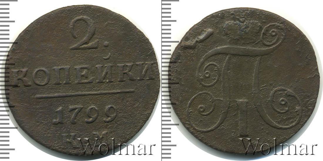 Вверху диска написана цифра «2». Под количественным обозначением номинала выгравирована валюта «КОПЕЙКИ». Сведения подчеркнуты прямой линией, ниже которой указан год эмиссии «1799» и товарный знак монетного двора «К.М.»
