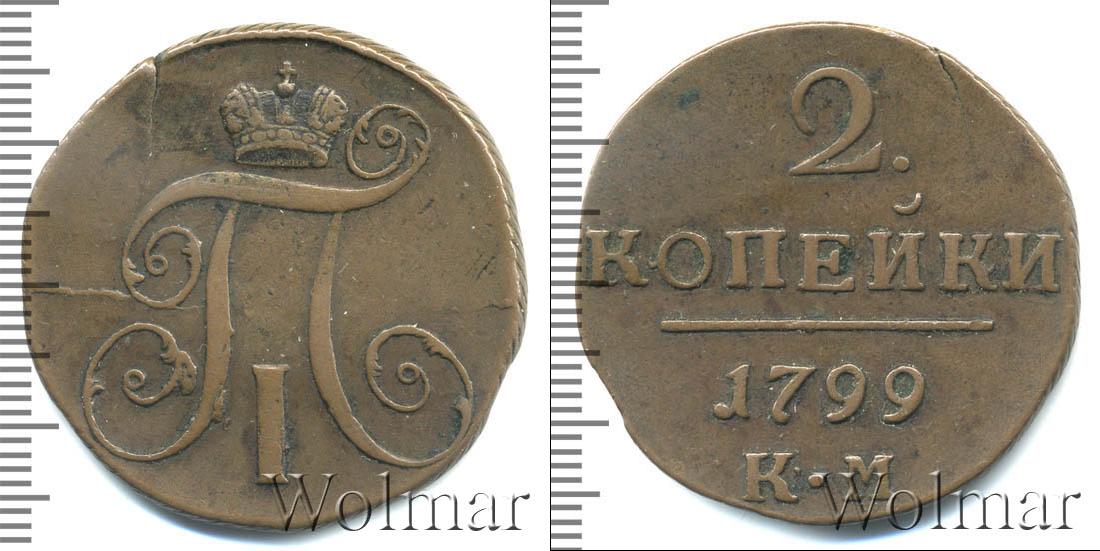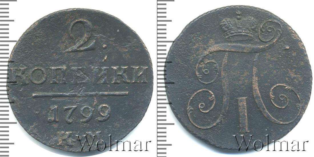 Вверху диска написана цифра «2». Под количественным обозначением номинала выгравирована валюта «КОПЕЙКИ». Сведения подчеркнуты прямой линией, ниже которой указан год эмиссии «1799» и товарный знак монетного двора «К.М.»