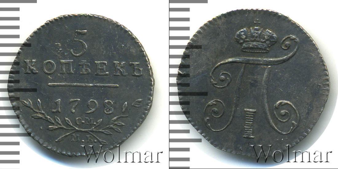 С этой стороны монеты выгравированы сведения о номинале и дате эмиссии партии (5 КОПЕЕК 1798). В нижней части диска изображены две ветки. Над ними нанесены оттиски «СМ» (монетный двор Санкт-Петербурга), и инициалы минцмейстера - «МБ».