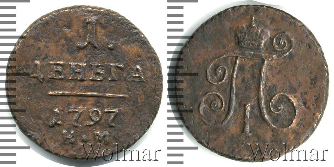 Номинал «1 ДЕНЬГА» указан двумя строчками в верхнем полукруге. В нижней половине диска есть указание о годе выпуска «1797» и товарном знаке монетного двора «К.М». В центре композиция разграничена ровным отрезком.