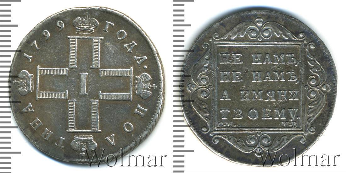 В верхней части диска мы видим указание на номинал монеты: ПОЛТИНА, а внизу сделана отметка о дате эмиссии «1799 ГОДА». По центру изображение инициалов Павла Первого в виде четырех букв «П», обрамленных коронами, и римской цифры «I» в центре.