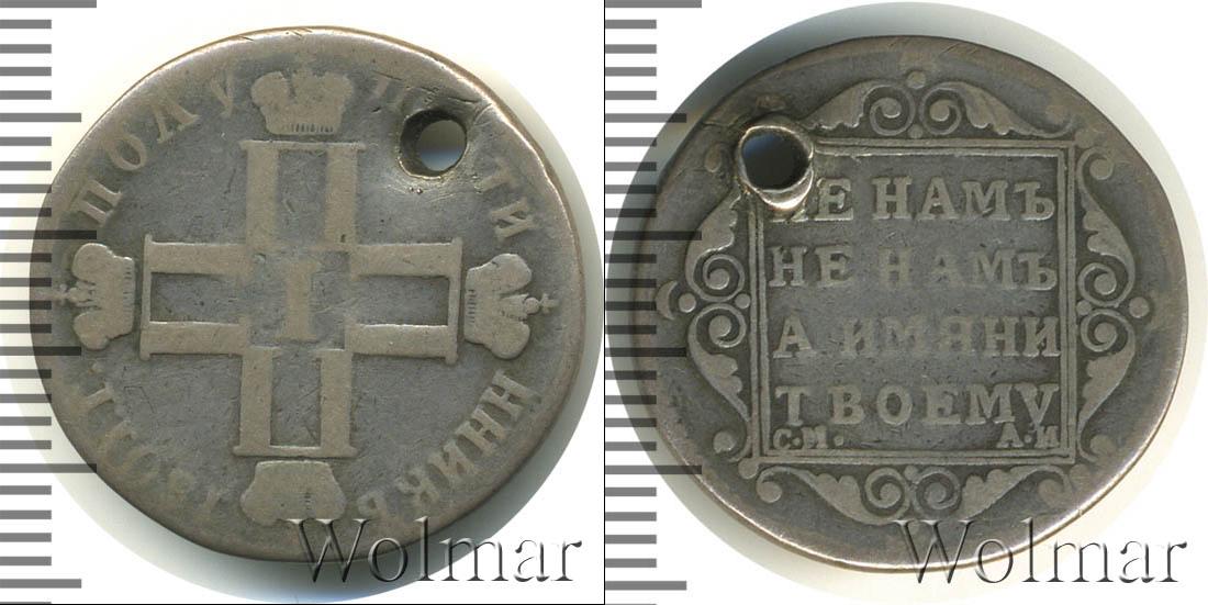 Монета отчеканена из серебра (проба 868/1000). По центру скрещенные инициалы Павла Первого (четыре буквы «П», римская цифра «I» и изображения Императорской короны России). Вверху отмечен номинал – ПОЛУПОЛТИННИК. В нижней части диска указана дата эмиссии – 1801.
