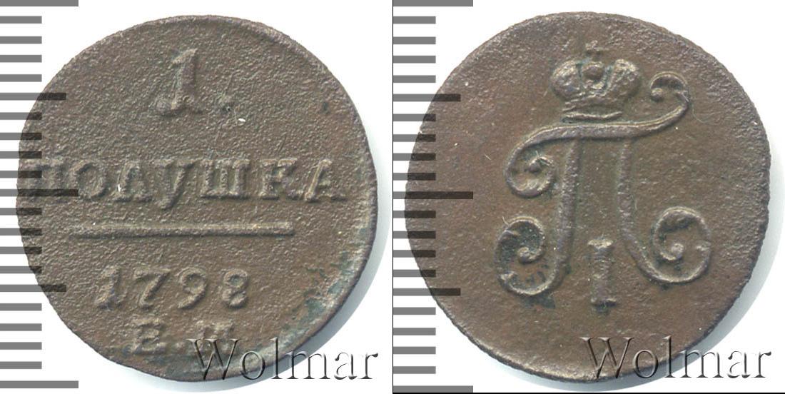 В верхней строчке указано количественное обозначение номинала «1». «ПОЛУШКА» выгравировано второй строчкой. Далее следует ровная линия, проведенная в центре диска. Ниже неё указан год эмиссии «1798» и товарный знак банка-эмитента в Екатеринбурге «В.М».