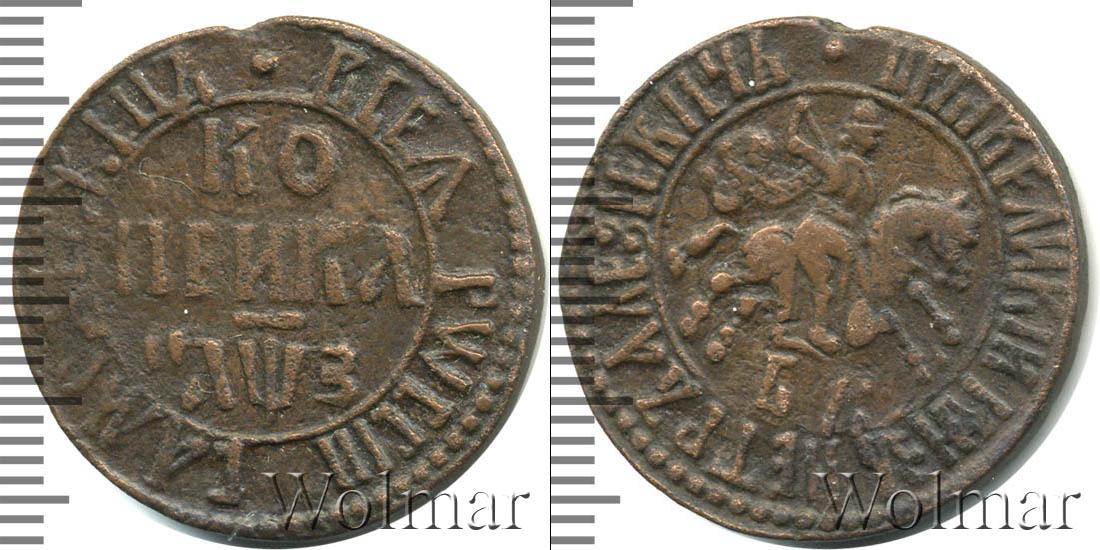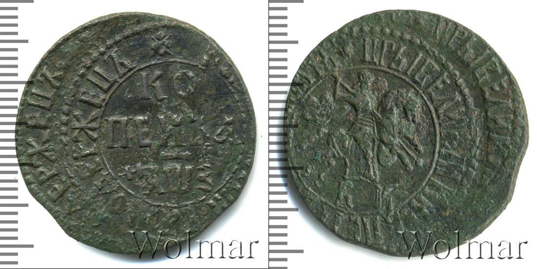 Вдоль канта монеты расположена надпись: «ЦРЬ IВЕЛИКIИ КНЗЬ ПЕТРЪ АЛЕ?IЕВИЧЪ». Она обрамляет изображение Георгия Победоносца в плаще, восседающего на коне. Над головой всадника изображена точка, а внизу по центру отмечен монетный двор «БК».