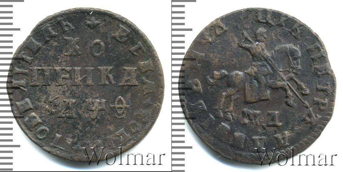 С лицевой стороны монеты изображен Георгий Победоносец, держащий в руке копье. Внизу под фигурой всадника сделана отметка о монетном дворе «МД». Также на диске монеты расположена надпись: «ЦРЬ ПЕТРЬ АЛЕ?IЕВИЧЪ».