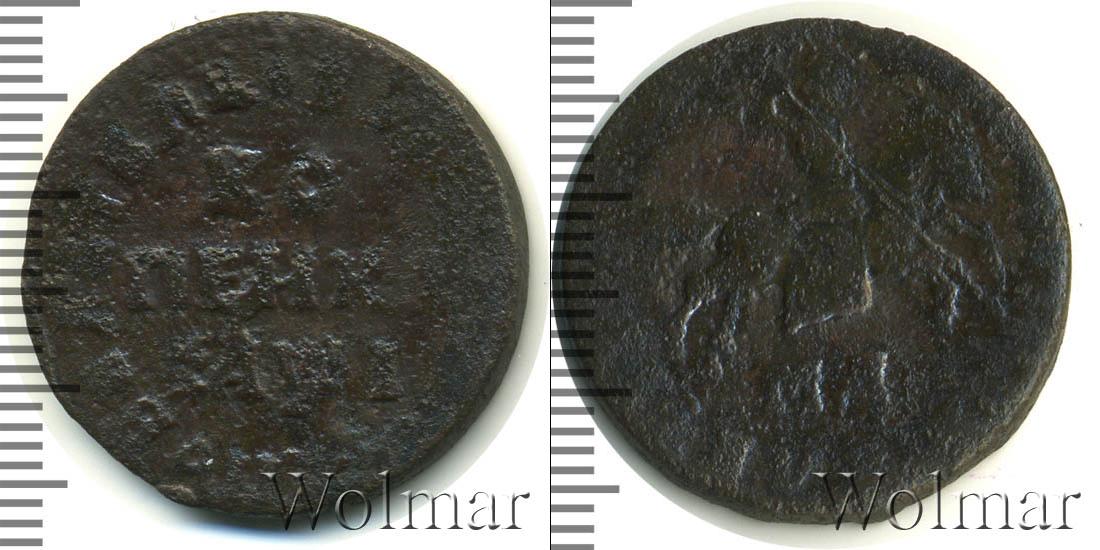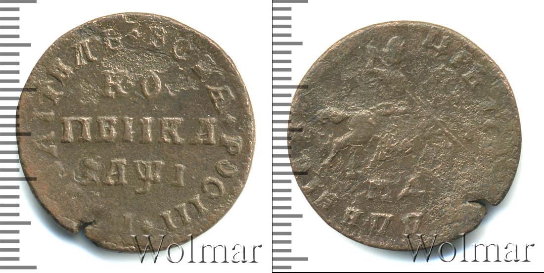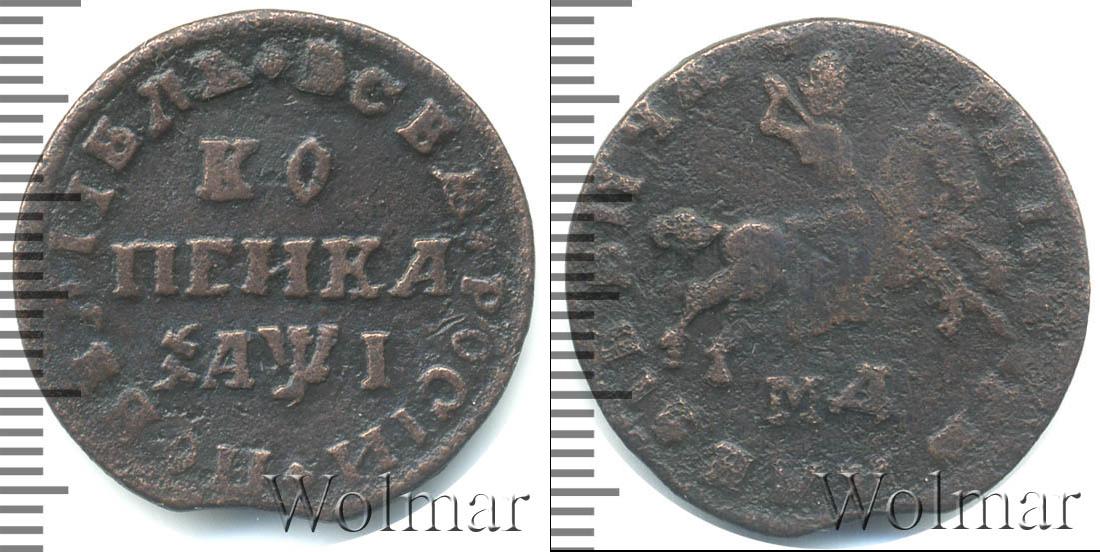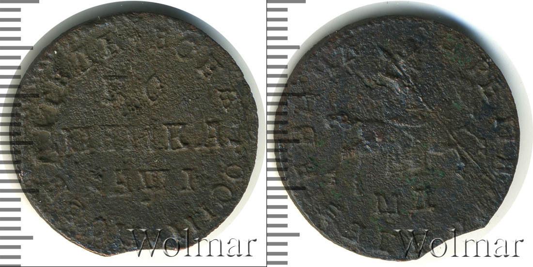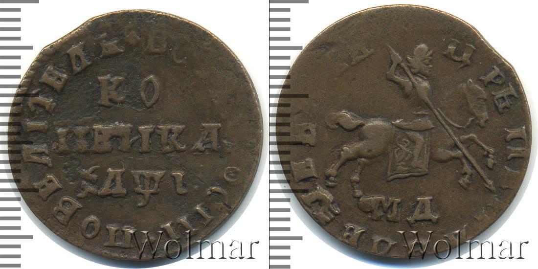 По краю диска монеты расположена круговая надпись: «ЦРЬ ПЕТРЬ АЛЕ?IЕВИЧЪ». В центре мы видим изображение Георгия Победоносца на коне. Под ним указан монетный двор, где была отчеканена эта партия «МД».