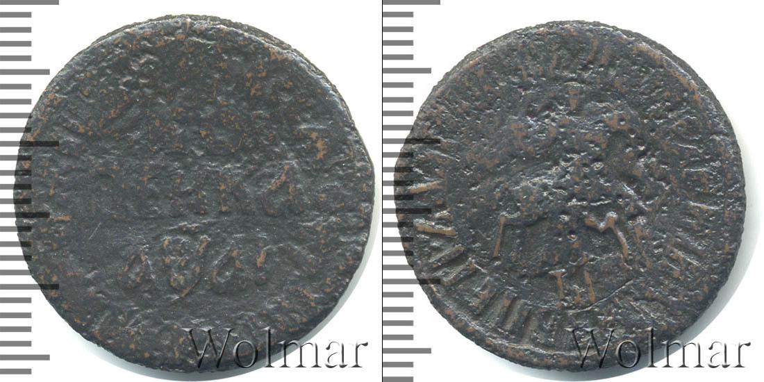 Внутри линейного ободка с надписью: «ЦРЬ IВЕЛИКIИ КНЗЬ ПЕТРЪ АЛЕ?IЕВИЧЪ» расположено изображение Георгия Победоносца на коне. Внизу мы видим обозначение монетного двора «БК». Над головой всадника изображена выпуклая точка.