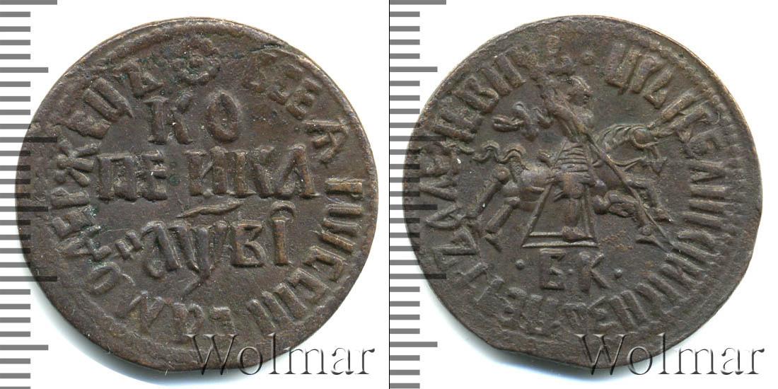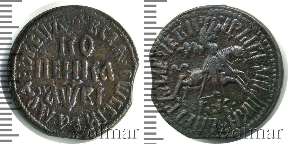 Внизу по центру диска отмечен монетный двор «МД». Над ним изображение Георгия Победоносца на коне и с копьем в руках. По всей окружности монеты расположена надпись: «ЦРЬ ПЕТРЬ АЛЕ?IЕВИЧЪ», а вдоль канта – зубчатый орнамент.