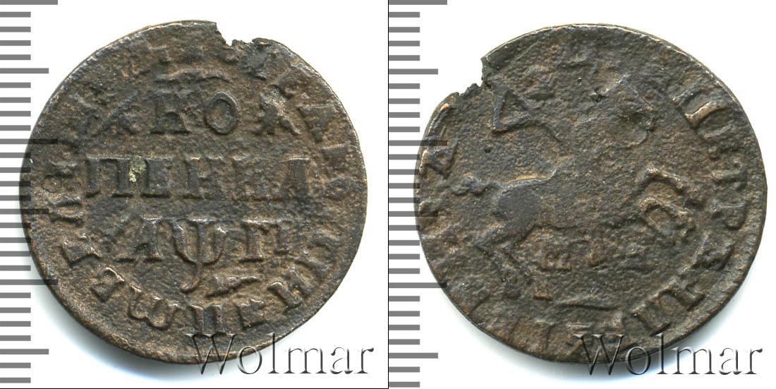В центральной части диска монеты расположено рельефное изображение Георгия Победоносца (на коне и с копьем в руке). Под фигурой всадника отметка о монетном дворе «НД», а по кругу диска идет надпись: «ЦРЬ ПЕТРЬ АЛЕ?IЕВИЧЪ».