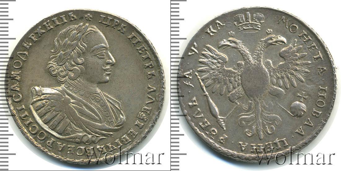 Распустивший крылья двуглавый орел, сжимающий в лапах скипетр и державу. По центру диска Герб Российской Империи, а по краю монеты выгравировано: «МОНЕТА НОВА? ЦЕНА РУБЛЬ ?А?КА (1721)» - номинал и год чеканки партии.