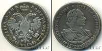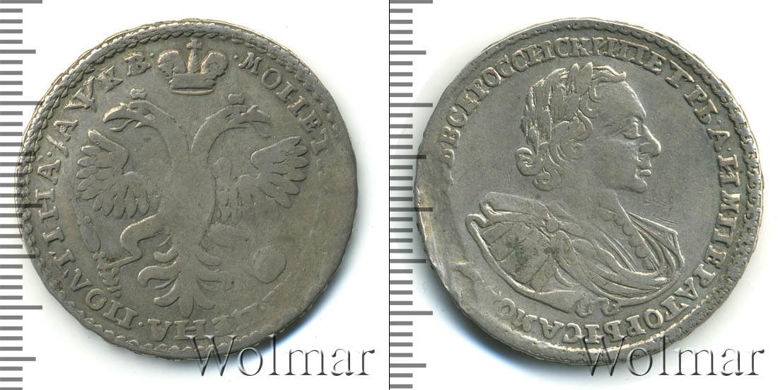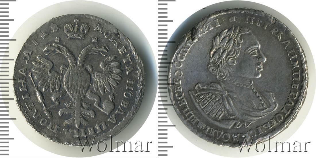По краю диска монеты идет зубчатый орнамент. В центре правый профильный портрет императора Петра Великого. Его обрамляет соответствующая надпись: «ПЕТРЪ•А•ИМПЕРАТОРЪ IСАМОДЕРЖЕЦЪ•ВСЕРОССИIСКИI•».