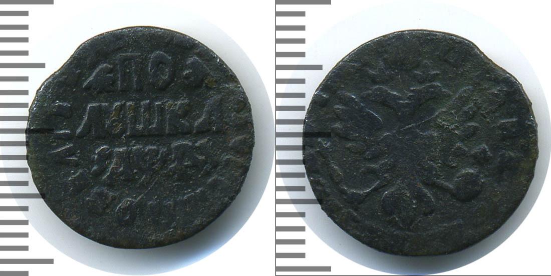 Одна из медных монет периода правления Петра Великого. Показан Герб Российской Империи в обрамлении надписи: «ЦРЬ• ПЕТРЪ• АЛЕ?IЕВИЧЪ». По краю диска расположен точечный ободок, как и с оборотной стороны монеты.